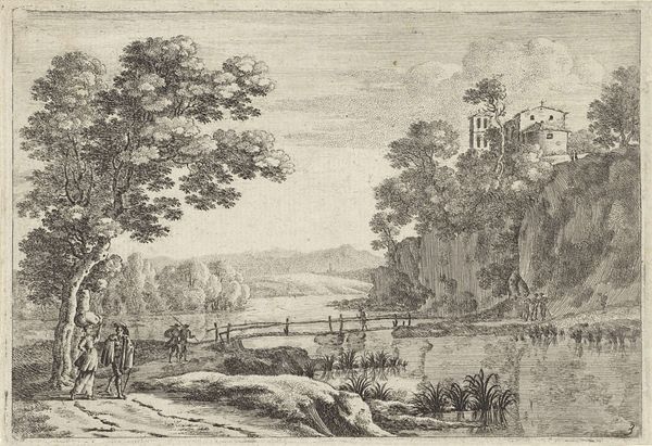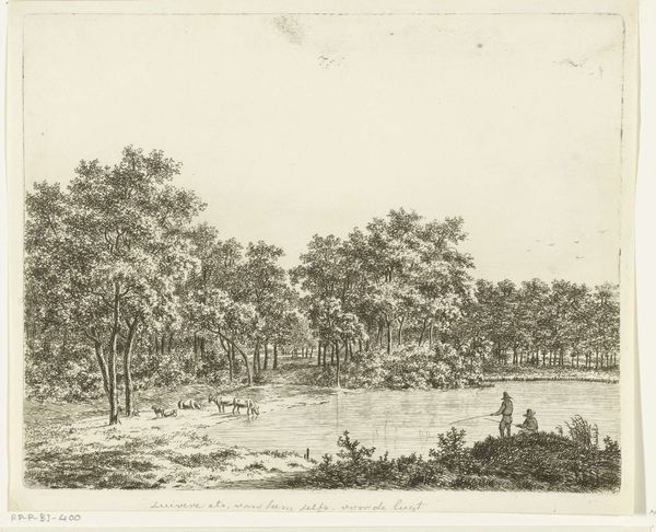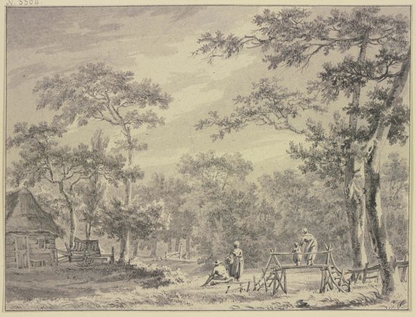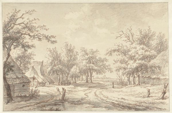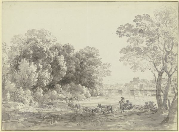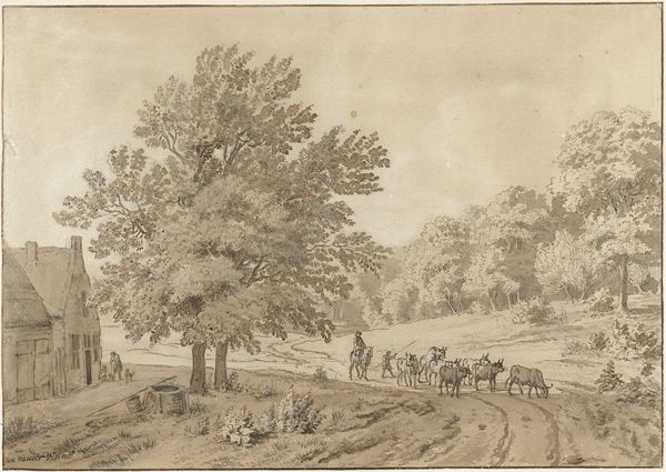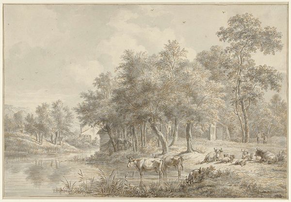 Curator: Here we have "Landscape with Trees, Riders and Some Cows in a Watering Place," created by Jan Laurensz. van der Vinne, sometime between 1709 and 1753. It appears to be an ink and watercolor drawing. Editor: It's a quiet piece. The monochrome palette creates a sense of stillness, even with the figures and animals populating the scene. The composition feels very balanced. Curator: Balance is key here. Notice how the artist uses line weight and tonal variations to create depth. The strong verticals of the trees anchor the composition, while the lighter washes suggest atmospheric perspective. This is also a wonderful example of 18th-century Dutch landscape drawing. Editor: How might social or economic shifts affect the style here? It seems more personal, more naturalistic, and less allegorical than earlier Dutch landscapes. Curator: That’s astute. During this period, we see the rise of a merchant class with leisure time, who perhaps sought less grandiose, more intimate depictions of the natural world. Van der Vinne was documenting the visible landscape rather than attempting some form of history painting disguised as nature. The very materiality of the watercolor and pen contributes to this lightness, an accessible way to depict leisure. Editor: The almost sketched, seemingly "unfinished" look really emphasizes immediacy. It suggests a moment captured, not an idealized or overly constructed scene. Did it feel radical at the time to present something this seemingly informal? Curator: Precisely. There would have been a shift from grand pronouncements towards more individualized sensory experience. It echoes the movement toward empirical observation in scientific and philosophical spheres during that time. A wider audience found this kind of observation comforting. The everyday scenes reflected the audiences’ growing aspirations for private life, nature walks, family outings. Editor: I'm struck by how this unassuming work invites you to slow down, to consider the everyday beauty around us. Curator: Yes, it exemplifies a move toward appreciating the here and now. The artwork reminds us that quiet contemplation can be just as profound as grand pronouncements.