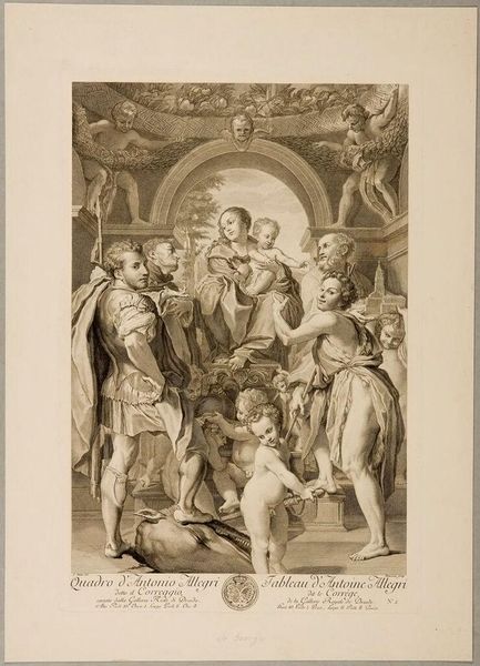 Editor: So, this engraving, “Maria met Kind en Johannes de Doper…” dating back to about 1750, reproduces an image by Nicolas de Beauvais. It's so intricate, but the scene is, well, pretty crowded! How do you unpack a piece with this much going on? Curator: From a historical perspective, the very act of creating this print highlights the power of imagery. Engravings like this were crucial for disseminating artistic styles and religious narratives to a wider audience beyond the elite who could view the original paintings. Who would have been commissioning this, and for what purpose? Editor: Interesting point! It is acting as a vessel of sorts. It would probably allow access for patrons who might not have had a chance to access original paintings. I suppose, churches may also have benefited? I think! But I can also imagine some affluent middle class patrons also enjoying access! But is it possible that this choice of image in itself makes some social statements? Curator: Absolutely. Reproducing a work featuring the Virgin and Child alongside various saints reinforces established religious hierarchies and the importance of these figures in the social and spiritual life of the time. Also, think about the original painting – why this painting was chosen and by whom would be an important question to explore the values promoted and reinforced through its reproduction. What effect does seeing it reproduced, versus in an original state, evoke within you? Editor: That is making me see it in a new way. Knowing its role in circulating visual culture and religious messaging enriches my understanding. Also, because it also emphasizes religious hierarchy, I wonder about how the religious institution controlled access, even visual, at that time. Thanks for pointing this out. Curator: Exactly! Considering art as a product of social forces and institutional agendas can open up really compelling avenues for interpretation. Thinking about the social life of images. Editor: Right, like, this wasn't just made to look pretty – it *did* something!