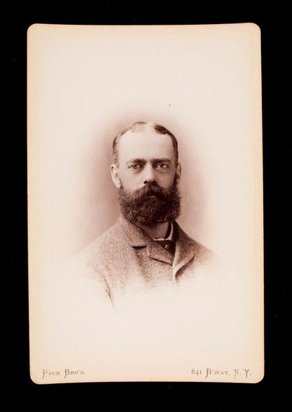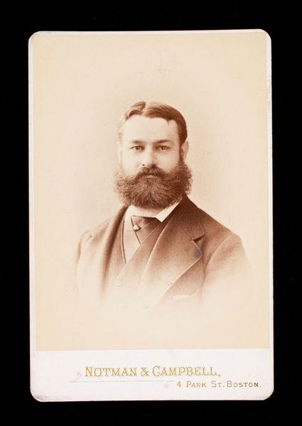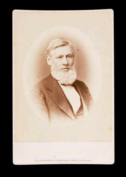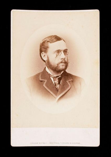 Curator: Looking at this vintage photograph, I'm immediately struck by a sense of quiet dignity. Editor: Quiet, yes, but there's also a certain wistful quality, like he's pondering something just beyond the frame. Curator: Indeed. This “Untitled (bust length portrait of man with beard, wearing glasses, labeled Hill)” is by William Notman. Notice the oval vignette, quite typical of the period, focusing our attention. Editor: It’s amazing how much personality comes through in a small, sepia-toned image. Those glasses perched on his nose—scholarly, maybe? Or just near-sighted like me! Curator: Glasses certainly carry connotations of learning and intellect, but also vulnerability; they invite closer scrutiny, a deeper connection. The beard, too, suggests a certain gravitas and maturity. Editor: It makes you wonder, though, what he really thought about while posing. Probably, "How much longer must I sit still?" Curator: Perhaps! In any case, it's a fascinating glimpse into a past era, captured with impressive clarity. Editor: A thoughtful portrait indeed. I feel like I know him a little, even though I don't.
