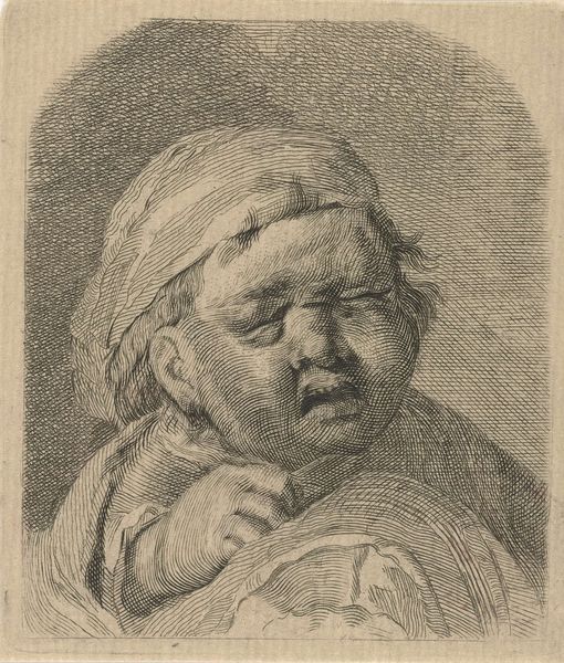 Curator: This drawing, "Baby Crying," is by Abraham Delfos, who was born in 1731. Its small scale allows for an intimate encounter with the subject’s distress. Editor: Oh, the little guy looks so furious! It's like that moment when you realize your ice cream is gone. Poor dear. Curator: Indeed. The work captures a moment of pure, unfiltered emotion. Given the period, perhaps it reflects societal views on the acceptable expressions of childhood. Editor: Or maybe Delfos just had a fussy baby at home! It's funny how universal that feeling is, across centuries. Curator: Absolutely. And considered alongside the Enlightenment's evolving understanding of human emotions, this image could be seen as a commentary on vulnerability. Editor: Well, vulnerability certainly still cries out to us, doesn’t it? Makes you want to give him a hug, or at least offer him some ice cream. Curator: It highlights the enduring power of art to connect us to our shared humanity. Editor: Agreed. It seems we’re all just big babies in fancy clothes, one way or another.