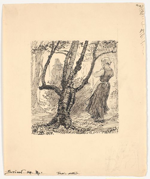 Curator: What strikes me immediately about this etching is the bleakness, the palpable despair emanating from the scene. The figure seems utterly defeated. Editor: Indeed. This is Alphonse Legros' "Death of the Vagabond," created in 1879. Legros, rooted in Realism, had an acute sensitivity to the plight of the working class, evident in his drawings, prints, and paintings. Here we see the social realities laid bare, absent of romantic idealization. Curator: It really does convey a strong sense of the weight of the world on the subject's shoulders, doesn’t it? I’m drawn to the raw emotionality of the piece, which speaks volumes about social and economic disenfranchisement of late 19th-century Europe. How might Legros' etching techniques relate to these themes? Editor: The medium itself, etching, is crucial. The line work, created through painstaking process of biting into metal, mirrors the harsh realities endured by the vagabond. Etching allowed for multiple copies. Legros aimed to bring this scene of poverty and abandonment to a larger public, urging them to contemplate their role in society and its structures of labor. It makes us think about access and the very act of observation as something with political potential. Curator: It’s also intriguing to consider the composition choices. Note how the landscape dwarfs the man, making him seem even more insignificant. I wonder what this conveys in terms of broader societal forces versus individual agency, no? Is there an assertion here? Are such individuals doomed under specific configurations of governance or economic realities? Editor: Exactly! The tree's gnarled branches, rendered with incredible texture through the etching process, serve as a visual metaphor for the man's hard life. Furthermore, this attention to texture forces the viewer to look closely. What kind of paper? What type of ink? Was this made by his own hands or produced in collaboration with other artisans? These production processes contribute directly to the content we encounter as observers. Curator: Examining the details regarding material makes it apparent that Legros wasn’t only interested in recording the life of this vagabond, but, it seems, offering a clear statement. It really humanizes a section of the population easily dehumanized. I have such renewed appreciation for it! Editor: Absolutely, and analyzing the materials further illuminates the historical context. We began with aesthetic and compositional impact. Ultimately, process unveils deeper narratives, which enhances the etching beyond sentimental imagery. Thank you for joining me!