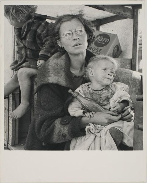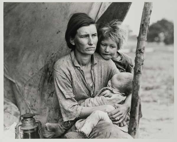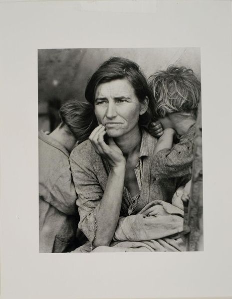 Dorothea Lange made this photograph, 'Migrant agricultural worker's family, Nipomo, California,' with a camera, and a keen sense of composition. Look at how Lange uses the gray scale to give shape to this family. The light falls in such a way as to make this woman seem monumental, like a sculpture. Her face, with its deep lines, isn’t just a portrait, it’s a map of hard times. The weight of her experiences seems etched into her skin. Consider the hand against her face. It is a brilliant focal point, drawing our eye. It speaks of worry, of a deep and abiding concern. Yet, there's also a quiet strength in the way she holds herself, a resilience that refuses to be completely defeated. It reminds me of Käthe Kollwitz's drawings, those raw, unflinching portrayals of human suffering, but here, softened with a tender touch. Ultimately, this photograph is not just a historical document, it’s a testament to the enduring spirit of the human heart.