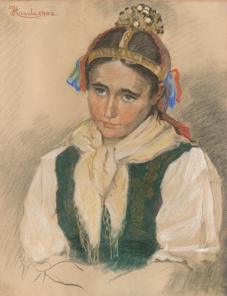 Editor: This watercolor painting, "Standing Girl in Traditional Costume with Skates," was created by Jan Veth sometime between 1874 and 1925. There’s a real stillness to it, a quiet seriousness in the girl's expression. The muted colors give it an almost melancholy feel. How do you interpret this work? Curator: I see a powerful commentary on the role of women in 19th-century Dutch society. Genre paintings like this one often romanticize traditional life, but let's consider the restrictions placed upon young women at the time. Notice how the clothing, while colorful, also confines her. And those skates – are they a symbol of freedom, or merely another prop in a carefully constructed image of domesticity? What do you think the skates represent? Editor: That's a great question! I hadn’t considered the idea of confinement within tradition. Maybe the skates offer a *hint* of autonomy within a structured existence. Curator: Precisely. Veth may be prompting us to consider the complex negotiations young women had to make. The girl's direct gaze suggests a quiet defiance, a refusal to be merely an object of observation. It makes me wonder about the power dynamics between artist and subject and how much agency the young woman truly had in how she was represented. Editor: Thinking about the historical context really shifts the way I see this painting. It’s not just a quaint depiction of a girl; it's a glimpse into the tensions of that era. Curator: Absolutely. And by examining those tensions, we can gain a deeper understanding, not just of art history, but of social history too. Editor: Thank you, that was really insightful.