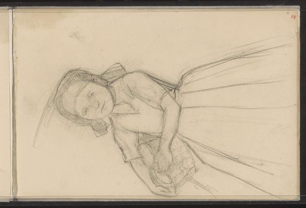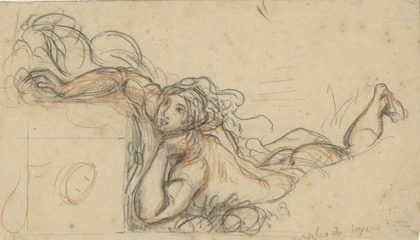Curator: The subtle greys of this pencil sketch really set the mood, don't they? It’s titled "Copy after Raphael's 'The Saint Catherine of Alexandria,'" created by Maria Vos in 1867. Editor: There’s a wistful quality, almost a dreamlike state suggested by the soft lines. The subject's head is tilted downward in quiet contemplation. It feels like a preparatory study, catching a fleeting moment of introspection. Curator: That's perceptive. Copies like these were crucial in academic art circles. Artists honed their skills by recreating the masters' works, absorbing their techniques and ideals. It's more than just a simple reproduction; it's an active engagement with Raphael’s vision. Editor: So, it is less about devotional practice and more about political awareness and training? The act of copying places Vos within a tradition and legitimizes her practice within a male-dominated artistic sphere. Saint Catherine herself is an interesting symbol too – a figure of wisdom and resistance. Is that the hilt of her sword we see at the base? Curator: Absolutely. The sword represents her martyrdom and her defence of Christian belief. And the very act of reproducing Raphael, the embodiment of High Renaissance ideals, suggests Vos saw great worth in aligning with a certain art-historical narrative. Remember that academic art dictated what was of ‘value’ for much of the 19th century. Editor: Interesting. I find myself more drawn to the medium. The deliberate, yet flowing nature of the pencil lends itself well to the contours of the human figure. The slight imperfections, the tentative strokes, reveal the hand of the artist in a way that a more finished work might conceal. Curator: I see your point. The pencil lends the artwork an intimacy; an unvarnished look that distances itself from the "high polish" favored in academic circles. Even in replicating a well-known work, Maria Vos still subtly brings her own distinct style to bear. Editor: Indeed. It encourages us to consider the context of its creation: a woman artist engaging with, and perhaps subtly subverting, the artistic conventions of her time. It invites us to appreciate the skill while also questioning the historical narratives that art embodies and reproduces. Curator: A fitting point to conclude on. It seems we both found something thought-provoking in this pencil study—a testament to its nuanced layers of meaning.