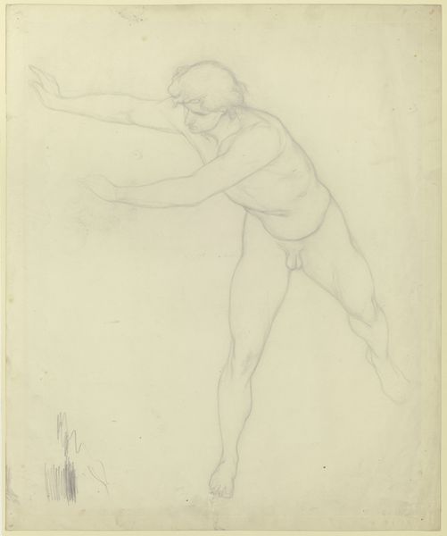 This is a pencil drawing of a standing male nude with his upper body bent forward, left arm raised, by Victor Müller. Although undated, it was likely made in France in the mid-19th century, perhaps during the artist's time in Paris. Müller was associated with the Realist movement, which challenged academic conventions. The image resonates with the period's fascination with the human body, made popular by the institutionalization of anatomy in the academy. Male nudes were traditionally employed in art education to teach students about the ideal form, which has its roots in ancient Greek and Roman art. This piece can be seen as an academic exercise or a study for a larger painting. To gain a deeper understanding, we can consult the archives of art academies. Knowing more about the curriculum of these institutions can clarify the role of Müller's artistic practice in the broader context of 19th-century French art.