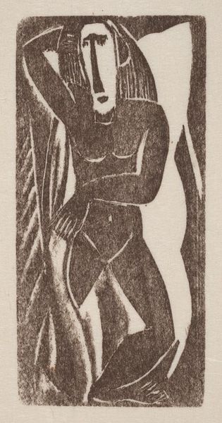 Editor: Here we have Max Weber’s “Standing Nude,” a woodcut from around 1919-1920. The figure is striking; it’s very angular and feels quite bold for a nude. How do you read this piece? Curator: This woodcut embodies a particular socio-political mood following World War I. Look at how Weber distorts the human form. That angularity speaks to the anxieties of the time. The German Expressionist movement, of which Weber was a part, grappled with the psychological impact of industrialization and the war on the individual. The art world in Europe was really responding to changes in culture. Editor: So, the distortion isn't just aesthetic; it reflects broader societal anxieties? It’s interesting that this distortion would have been deemed desirable, something museums would choose to put on display. Curator: Precisely. The public role of art shifted, especially within institutions like museums. Instead of simply celebrating beauty or traditional values, art became a vehicle for exploring complex and often uncomfortable truths. Expressionism used art to address issues such as alienation. The fact that museums began exhibiting such works signaled a broader acceptance of art as a platform for socio-political commentary. Consider also who would have been included or excluded at this time based on race, class, gender, etcetera. Editor: It's amazing how much context can be embedded in one image. I had looked at other examples of his work, and while it feels modern, I never considered the active, rebellious, role museums might have taken with such choices in the early 20th century. Curator: That's the power of historical analysis! It helps us unpack the layers of meaning and understand how art shapes and is shaped by the world around it. Editor: Definitely gives me a lot to think about regarding the images that are deemed museum worthy and when.
