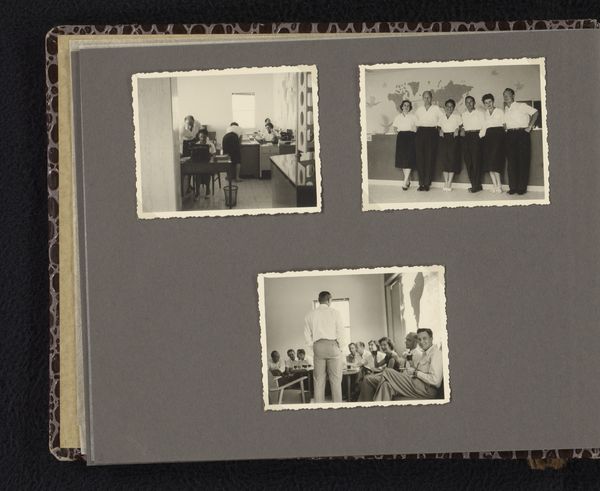 This photo titled 'Collega's van Isabel tijdens haar periode bij KLM, 1954, Israël' was taken in 1954 in Israel by an anonymous photographer. The gelatin silver prints and paperboard of the album page, create a kind of ready made grid. It reminds me that artmaking is always a process of selection and arrangement. The black and white images of the colleagues is a kind of found painting. The slightly wonky angles of the photographs, and the way some of them overlap, gives the album page a dynamic energy, like a collage. I love the contrast between the formality of the subjects and the playful arrangement on the page, it reminds me of artists like Gerhard Richter, or even the diaristic impulses of Nan Goldin. Each photo is a little world in itself, telling a story about work and leisure. Look at the bottom left image, the man relaxing with his shirt off on a sunny day, and the guy in the bottom right working hard at his typewriter! This piece suggests that art is about embracing imperfection and finding beauty in the everyday.