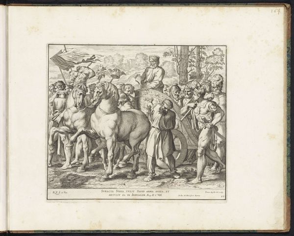 Editor: So, here we have "Val van Jericho," a 1675 engraving by Pietro Aquila. Looking at this print, the thing that strikes me most is the energy of the composition. There’s a real sense of forward movement created by all these figures. What’s your take on this piece? Curator: The orchestration of line is certainly dominant. Note the careful hatching used to define musculature, especially across the backs and arms of those laborers hauling the beams. Also, attend to how the artist varies line weight to suggest depth; those figures further away are rendered with finer, less distinct marks. Editor: That’s interesting. I hadn’t really considered the use of line weight so deliberately. The crumbling architecture in the background seems to also contribute to a sense of chaos, doesn’t it? Curator: Precisely. Observe how the engraver juxtaposes the crumbling walls of Jericho, realized through broken, irregular lines, with the relatively smooth, consistent lines defining the bodies of the soldiers. This formal contrast underscores the disruption of order inherent in the subject matter, the siege itself. Note, however, the regimented rows of the figures contrasted to that crumbling architecture which offers a conflicting sense of chaos against that human intention. Where do you see other formal contrasts at play here? Editor: Maybe in the use of light and shadow? The figures seem to emerge from a darker ground. I guess it spotlights them and enhances the drama? Curator: Yes, consider how the interplay of light and shadow contributes not only to dramatic effect but also to the illusion of three-dimensionality on a two-dimensional surface. Ultimately, the network of these visual relations defines the essence of the piece. Editor: I see, I’m starting to see that all of these separate aspects add up to reinforce the message. Thanks, that was illuminating. Curator: My pleasure, every viewing brings about new observations and realizations about a works intrinsic structure.