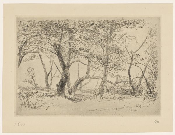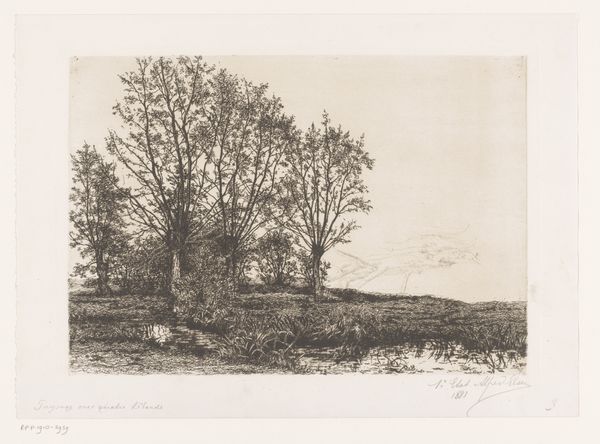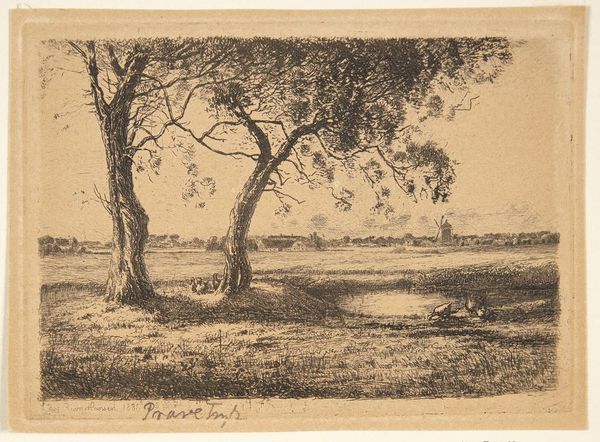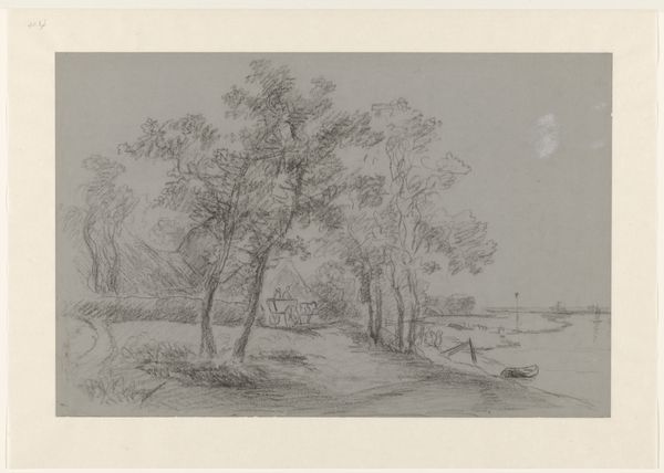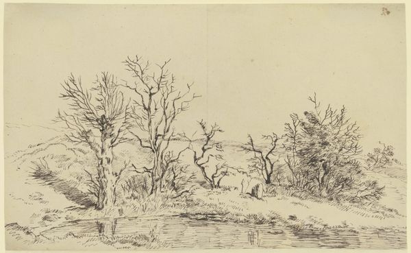 Louise Ravn-Hansen created "Landskab med piletræer ved et vandløb" using pen and ink on paper. The drawing presents a tranquil waterside landscape dominated by two prominent willow trees in the foreground, a composition that evokes a sense of serene contemplation. The artist's formal decisions are particularly striking. Ravn-Hansen uses delicate, precise lines to delineate the forms of the trees, capturing their intricate branching patterns. The open space between the trees and the distant shore creates a sense of depth, subtly destabilizing any fixed perspective. The composition adheres to the basic rules of perspective but the soft, diffused light flattens the image and reduces the sense of volume. Consider the semiotic implications of the willow tree as a traditional symbol of mourning and resilience. Ravn-Hansen subtly incorporates this cultural code, perhaps reflecting broader philosophical concerns about nature. This piece emphasizes the inherent ambiguity of art, where the artist offers a visual language ripe for interpretation.