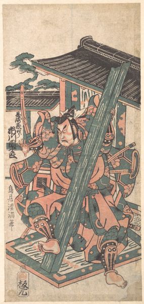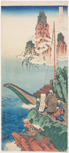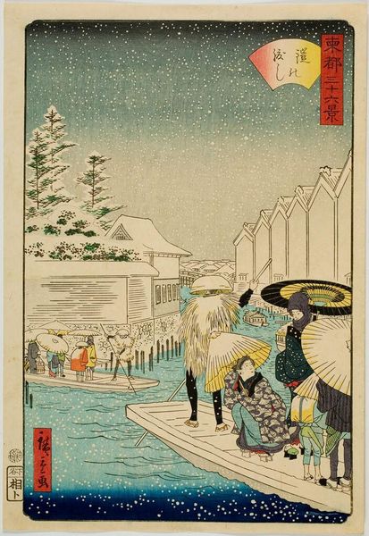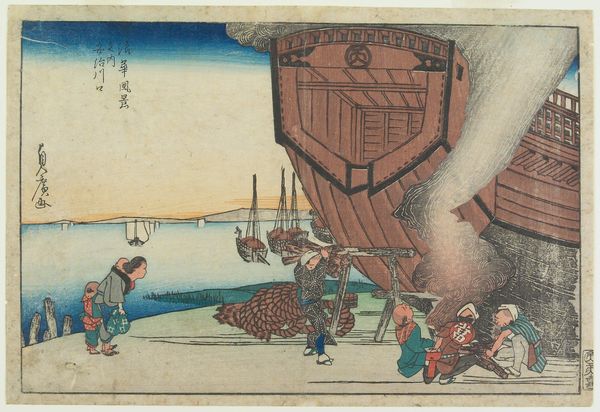 Curator: This woodblock print by Utagawa Kuniyoshi captures Edo firemen demonstrating ladder-climbing during a festival. Editor: My first impression is the sheer audacity of that vertical ladder against the vast sky, it feels like a pathway to enlightenment or some other transcendental state. Curator: Indeed. The display of firefighting skill wasn’t just practical; it was a public spectacle deeply embedded in Edo society and its communal safety. Editor: Look at the kites in the background! They mirror the climber’s aspirations. It’s a wonderful visual metaphor connecting earthly skills with boundless possibilities. Curator: The firemen, celebrated as heroes, occupied a unique social position. Their displays were a form of public theater, reinforcing their status within the community. Editor: And the composition—the solid base of firemen contrasted with the lone figure at the ladder's apex—creates a powerful image of collective effort and individual courage. Curator: It’s fascinating how Kuniyoshi’s print both documents and celebrates the role of these firemen in the urban landscape of Edo. Editor: For me, it underscores how everyday skills and communal events are loaded with symbolic significance. It transforms even the mundane into something sublime.