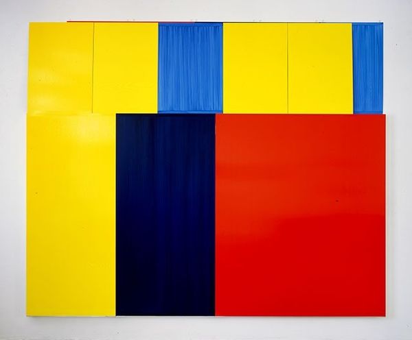 Curator: Looking at this intriguing piece, what are your first thoughts? Editor: It feels very… fragmented. A bold, clashing of colors and forms. It evokes a sense of disruption, maybe even anxiety, hidden beneath a playful, pop-art-esque facade. Curator: You've picked up on its dynamic tension right away. This is "New Frontiers (Slogan von J.F. Kennedy)" created in 1964 by Samuel Buri, an intriguing piece working with mixed media and acrylic paint on wood. The title suggests a connection to the optimism, yet this abstraction leaves us questioning exactly what kind of new territory he envisions. Editor: "New Frontiers," especially tied to Kennedy's legacy, is such a loaded phrase. Post-war, pre-civil rights, this image complicates any easy sense of progress. The colors almost feel like propaganda—red, white, blue, the bright yellow. Is Buri critiquing that unbridled optimism or perhaps pointing to what gets left out of such a bold declaration? Curator: Exactly, the geometric forms can read as symbols, yet they're elusive, resistant to fixed meaning. We are familiar with the use of yellow as symbolic of the betrayal and double dealing from ancient traditions but it appears to dominate here along with the suggestion of "frontier" or pathmaking marked by broken lines. There is definitely continuity and collective memories being invoked through the use of colour as an access point here. Editor: The fact that it’s on wood adds another layer. It's not simply paint on a flat surface, but a built, almost architectural construction. This layered element adds further weight and texture to the artistic message of this cultural moment. Buri really is pointing toward multiple ideas here at once! Curator: Precisely. And think about that timeframe: 1964. Kennedy's assassination just the year prior; a collective hope dashed. Buri utilizes bold artistic methods, a chaotic yet strangely cohesive commentary on a specific era and it's own set of dreams. Editor: It becomes a sort of memorial then, doesn’t it? Not a romanticized monument, but a raw, unresolved expression. One which makes us ponder how rhetoric and reality often collide, especially where progress is concerned. Curator: An invitation to reassess the iconography we so readily accept. Editor: I’ll carry that insight with me as I keep engaging with it. Thanks!