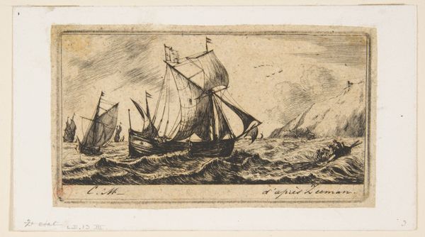 Editor: This etching, "Zeegezicht met zeilschepen," is attributed to an anonymous artist from the Dutch Golden Age, somewhere between 1650 and 1750. It feels like more than just a seascape; the rough waves and the way the ships are battling the sea conveys some greater historical context. What symbolic weight do you see within this piece? Curator: The enduring symbol of ships at sea, particularly from the Dutch Golden Age, evokes trade, exploration, and, more broadly, human ambition. The tumultuous sea, etched with such nervous energy, is just as potent. Do you notice how it practically writhes beneath the vessels? Editor: Yes! The sea seems almost angry, contrasting with the stoic ships. Curator: Exactly. Water often represents the subconscious, the chaotic, and the uncontrollable, doesn't it? Here, it's actively challenging those emblems of human endeavor. Think about the collective memory embedded in these images – the stories of naval power, mercantile dominance, but also shipwrecks, loss, and the sheer unpredictability of nature. Editor: So it’s more than just pretty ships; it’s about power, risk, and a sort of human-versus-nature drama. Curator: Precisely! Consider the flags: barely legible yet undeniably present, little wisps asserting national identity. The print then encapsulates the cultural anxieties and aspirations of an era, a tiny drama playing out on a vast stage. What resonates most with you from the piece? Editor: It's interesting how so much history and meaning can be packed into such a small and unassuming image. I see the dynamism now between man and nature. Curator: Indeed! This little print reminds us how potent and complex even the simplest image can be.