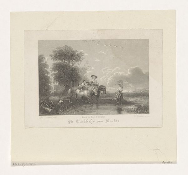 Curator: This is "Gezicht op Amalfi," a print made between 1824 and 1826 by Andréas Pic. It's a striking landscape scene. What strikes you initially? Editor: The tonal range is masterful; it evokes a peaceful, almost melancholy atmosphere. The soft light suggests a liminal time of day, maybe dawn or dusk. It's meticulously crafted, emphasizing clarity of line and shape. Curator: It certainly encapsulates Romantic ideals. Artists were drawn to the sublime in nature, and Italy was seen as a kind of spiritual home, away from the rapid industrialization of Northern Europe. The print captures that longing. Editor: Yes, you can read the mountains as sublime, framing the humble human activity occurring along the bridge. I’m drawn to the composition, with the bridge acting as a literal and figurative link between elements of the image. There is such an even balance achieved, formally speaking. Curator: Indeed. The bridge not only connects the human world, represented by the mill and figures crossing, with the natural world of the mountains but the figures shown seem intentionally selected. It highlights how rural areas continue to necessitate collaboration with animals for the transit of goods, for example. Editor: And the technical skill in rendering that watermill! The detail of light playing on its surface—the etching is phenomenal. Semiotically, what could the presence of a watermill, a site of both creation and ruin, symbolize in conjunction with that small familial cluster crossing? Curator: That very synthesis between nature and human progress represents an intriguing commentary when we consider the politics surrounding environmental concerns present at the time and ever since. How do we engage with these sublime and abundant spaces responsibly? This print, therefore, operates as a document of its time. Editor: It really brings up complex interpretations in a simple rendering of landscape. Thank you. Curator: My pleasure, let’s move on to the next.