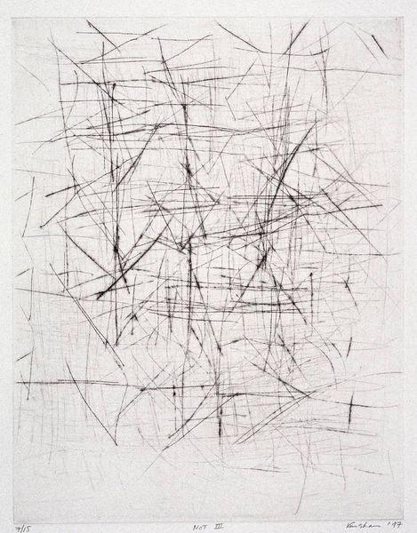 "The Geeks" by Cy Twombly is like a beautiful storm of scribbles trapped on a surface, made with something simple like graphite or charcoal. The artist clearly wasn't after perfection here, but more interested in seeing where his hand would take him, a real record of movement and chance. Looking closely, you can see each line has its own character. Some are dark and bold, others are faint whispers. Some wiggle and dance like spaghetti. It's a whole universe of marks living together. There's one particular area on the left, where the lines bunch up, almost like a tangled fishing net. It's dense and chaotic. This part shows how the build-up of simple marks can create a complex texture, like the layers of our own thoughts. I'm reminded of drawings by Brice Marden, who also used repetition to build dense and mesmerising compositions. Both artists invite us to find beauty in the imperfect and the open-ended.