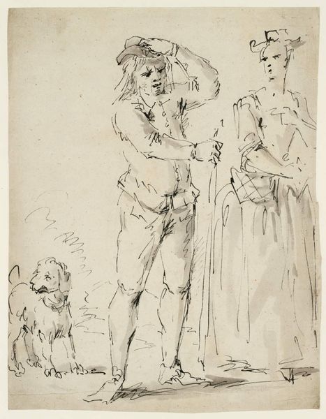 Curator: Looking at this delicate drawing by Jacques Callot, "A Cavalier with his Lady," created with pen and India ink, one is immediately struck by the intricate detail despite its modest scale. Editor: Indeed! My first impression is one of understated elegance; the etching technique feels remarkably precise. You almost imagine the clothing swishing with them! What can you tell us about this context? Curator: Callot lived from 1592 to 1635, and he worked extensively with printmaking techniques that were becoming quite popular at the time. This piece, showcasing a fashionably dressed couple, exemplifies how dress functioned as a symbol of social status and aspiration within the context of the baroque era. These figures weren't simply wearing clothes; they were performing a specific role in society. Editor: And if we consider the means of its creation, that etching—that method of production itself—contributes to this performance, does it not? The etching process and then the dissemination of images. We see how reproductive technologies shape art and society simultaneously, with craftsmanship made available to a wider audience through prints, though with limited viewership at the time! The drawing then is one aspect of its journey, material and cultural. Curator: Precisely. Callot used innovative etching techniques to create finer lines, leading to a level of detail previously unseen, thereby democratizing the image-making of elites, even though it's still for the privileged. How do you think such detailed observation of costume would affect the viewership? Editor: For the burgeoning middle classes especially, the availability of such detailed depictions would reinforce existing social structures whilst, for those outside, these might act to provoke or incite different views of court and class, even subversion! The image functions within complex webs of institutional power, reinforcing hierarchies of the day, but does this, always? Curator: That is a powerful reminder of the complexities involved in our observation. Studying "A Cavalier with his Lady" pushes us to remember not only how artwork is made but the societies they live in, from production to consumption. Editor: Callot’s drawing really is a testament to the interplay of socio-historical context, skill, and our ability to extract narratives from lines drawn centuries ago!