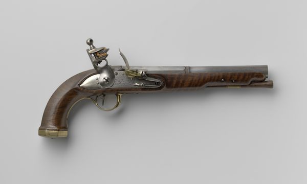 Curator: Here at the Rijksmuseum we have an early 18th-century flintlock pistol by P. Boudson, crafted around 1705 to 1710. Made from wood and metal, it exemplifies the Baroque aesthetic even in a functional object. What's your initial reaction? Editor: Well, apart from the obvious implications, the overwhelming sensation is elegance. The sinuous curves, the polished sheen of the metal...it almost belies its violent purpose. The craftsmanship speaks volumes, it projects confidence and control. Curator: Precisely! It embodies the Baroque love of ornamentation and the desire to elevate everyday objects into works of art. Consider the stock of the pistol – the carved wooden handle isn't merely functional; it's an opportunity for artistic expression. Its mere form suggests cultural continuity from antiquity. Editor: I see how the maker integrated complex aesthetic patterns into functional space. Notice the engraved floral patterns? How might the cultural memory surrounding flower motifs influence perceptions of status, control, even beauty in this otherwise weapon? Curator: The Baroque period thrived on such visual vocabulary, especially so here in this particular cultural sphere. Owning such a piece communicated more than simple self-defense. It alluded to notions of power, wealth and good taste. It transforms the bearer into an instant representation of wealth and social position. Editor: Let's not forget, though, the inherent contradictions here: A beautiful object designed for violence. Does its artistic quality somehow normalize or glorify the act it's meant to facilitate? The metal suggests brutal force while its gilded form promises luxury. Curator: An excellent point. And remember this object was more than simply metal and wood. It's inextricably tied to European Colonial history. To possessing land by means of force. The psychology behind how this seemingly innocent item affected nations will forever be up for debate. Editor: Thank you for that enlightening background. The juxtaposition of artistry and utility now seems more jarring than ever. Curator: And thanks to you, for a new and vital understanding. It’s essential to understand the cultural contexts that shaped it.