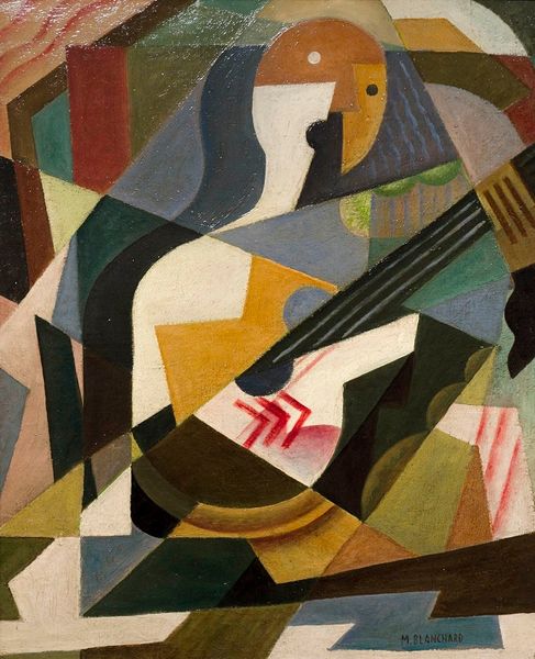 Curator: What strikes me immediately about María Blanchard's "Le Joueur De Luth," painted around 1917-1918, is its geometric fragmentation. There's almost a muted harmony in the interplay of angles and curves, even amidst the deconstruction of form. Editor: For me, the muted tones are very reflective of Blanchard’s personal life, which was often plagued with suffering. The choice of a lute player feels deliberately anachronistic—perhaps representative of marginalized voices finding beauty and solace through musical traditions within exclusionary societal systems. Curator: Absolutely. One might consider the artwork through the lens of early 20th-century modernism, exploring themes of representation and the breakdown of traditional perspectives. The figure becomes almost an arrangement of geometric volumes. Notice the color relationships at play: how the various shades of browns, greens, yellows, and blues coexist to create visual tension and unity. Editor: But shouldn’t we also interrogate *who* this lute player is likely meant to represent in Blanchard's lived reality? Consider Spain’s complex cultural tapestry that involved historical conflicts alongside various influences on musical genres and consider also the painting was made around WW1, a turbulent historical point. Are those shapes representing the dismantling of traditional structures and expectations imposed on artists—particularly on women artists like herself at the time? Curator: It's a valid and necessary reading, situating the artwork within its sociopolitical framework to unveil deeper meanings about Blanchard's identity and response to broader contexts. Yet the Cubist style also prompts investigation into the way Blanchard understood and visually rendered objects. Take, for example, how Blanchard dissects and reassembles aspects of an object and also, the subject. Editor: Indeed, looking at her biography, she belonged to what many refer to as “the lost generation”, displaced and disenfranchised by societal inequities… Seeing these fragmented elements through *that* lens might shed new light onto its emotional resonance as well. Curator: Considering all these components together truly allows us to gain new levels of appreciating complex intersections woven through Blanchard's masterful approach—technique with historical circumstance gives added depth… Thank you. Editor: Likewise. Examining “Le Joueur De Luth" from both these approaches amplifies how we read the many identities art pieces ultimately can showcase, shifting perception over generations and across our lives!