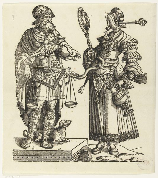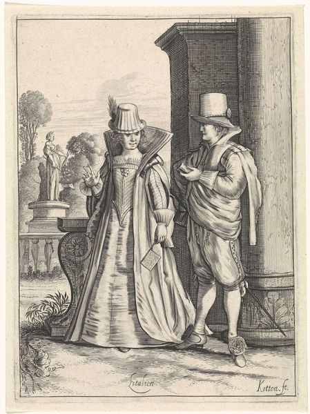 Pieter de Jode I made this engraving, *Nobilium in Belgio Utriusque Sexus Ornatus*, sometime around the turn of the 17th century. The title translates roughly to “Nobles of Both Sexes in Belgian Clothing.” It's fascinating to consider the labor involved in creating prints like this. Each line you see was carefully incised into a copper plate, a painstaking process demanding immense skill. The image would then have been printed onto paper. Here, the material and method elevate clothing into a status symbol, quite literally etched in history. The weight of the garments worn by this couple is palpable; the folds and textures meticulously rendered through de Jode’s mastery. The work prompts us to consider the social context of fashion and the amount of work involved in the production process. It also forces us to see the image as an early form of documentation. Ultimately, this print is a testament to both de Jode’s artistry, and the skilled labor required to produce an exquisite piece of cultural record.