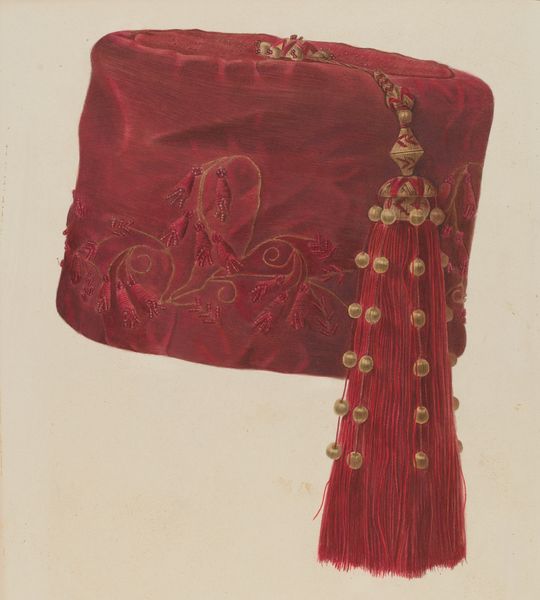 Curator: It's lovely, this study of a poke bonnet by Nancy Crimi. Done around 1938, it's watercolor and drawing, with a distinctive velvety texture despite the lightness of the media. What's your initial take? Editor: Mmm, muted longing. That deep red, almost maroon, isn’t joyous, but it isn’t exactly somber, either. It speaks of faded affections, perhaps, or cherished memories carefully preserved. Curator: I love that – faded affections. The poke bonnet itself is such an evocative object. Restrictive yet protective. There's a strong sense of concealing or shielding the wearer, creating a little private world. The visual focus and color suggest something held close. Editor: Exactly. Visually, the large size of the ribbon on the front hints at binding, controlling...while the longer ribbons that hang suggest perhaps looser ties, but the color ties it together. Red traditionally has quite complex connotations, and the sense of passion or violence in this work seem to be under a powerful restriction. It also echoes, of course, the heart. Curator: Yes, that crimson cord connects directly to life, and to loss, too. In a way, Crimi manages to take an ordinary item, a humble piece of clothing, and imbue it with powerful, deeply personal associations. Did it cover or express something vital? I’m deeply intrigued...and I wonder, who was meant to see this? Editor: It prompts us to contemplate identity and social context, too. Head coverings – and the way women’s appearance has historically been governed and presented in art -- continue to trigger associations regarding social roles and individual expression. It seems especially charged to focus solely on the bonnet as if the wearer's gaze is irrelevant, almost entirely forgotten. Curator: Well, Nancy Crimi really gave us much more than simply a portrait of clothing. Editor: Indeed. It's more like an icon. The essence of experience transformed into a tangible, visual thing, and charged by absence.