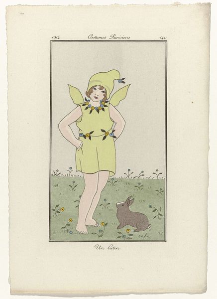 Curator: This delicate image is titled "Journal des Dames et des Modes, Costumes Parisiens, 1914, No. 140 : Un lutin," which translates to "A Goblin" in English. Executed in pen and ink, this piece embodies the Art Nouveau style, rendered by the artist identified only as Monogrammist MFN. Editor: It feels like a child's daydream. Simplistic lines form a figure dressed as a pixie, a sort of fashionable sprite standing in a field of miniature flowers, with a rabbit looking up at her. It has a naive quality that's instantly charming. Curator: What strikes me is the context. "Journal des Dames et des Modes" was a real publication showcasing Parisian fashion. To present a goblin-like figure reveals an intriguing commentary on the whims and fancies of the upper class, and the fashionable costume balls that marked high society at the time. It reflects a desire to escape into fantasy. Editor: Precisely. The symbolism of goblins, even "cute" ones, leans into trickery, mischief. Are we to understand that fashion itself can be a sort of enchanting deception, a playful manipulation of appearances? Even the flowers decorating her person and in the ground where she stands suggests an Eden-like scene—but also, perhaps, a more precarious, temporal state. Curator: Perhaps. Though I am keen to also consider the social moment it appeared—almost at the brink of WWI. Images like these created a counterpoint of light-heartedness in a society bound to face unprecedented hardship, where nostalgia itself turned into escapism. Editor: An interesting counterpoint. Certainly the presence of the rabbit could signal innocence and vulnerability—but also speed, agility, even heightened sensory awareness of lurking danger! Curator: Ultimately, whether whimsical, a darker fantasy or indeed just a symbol for escape, it certainly encapsulated a moment of immense change on the brink, didn't it? Editor: Indeed! And regardless, a visual testament to the idea that even fashion could delve into the realms of the fantastic and allegorical.