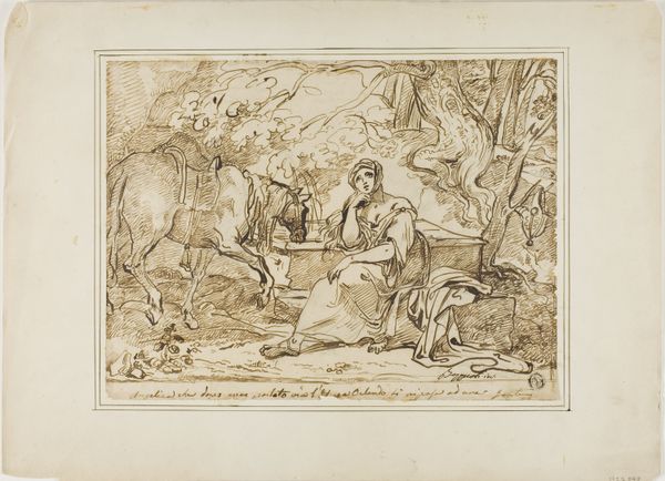 Curator: At first glance, it evokes this airy lightness, like a dream sketched on the back of an envelope, almost ephemeral. Editor: And it really is. This is François Jacques Fleischbein’s "Young Man with Bow and Arrow," made in 1832, currently residing at the Metropolitan Museum of Art. It's a pencil drawing, but looks remarkably like a print, capturing a figure posed amid what looks like an idealized, classical landscape. Curator: Idealized indeed! He seems so serene, so self-assured. Almost aloof, perched on the rocks like he was born to rule them, with the sweetest little wiener dogs at his feet! But this "youth," what story is Fleischbein trying to tell? He definitely strikes a god-like pose with that bow, yet also possesses this grounded human element, thanks to the dogs. Editor: Interesting. He's situated between classical realism and a subtle historical painting style. There's a sense of staging here, pulling the tradition of Renaissance idealized portraiture. Though presented as a simple line drawing, it speaks to the culture of presenting young men—particularly young men of privilege—in noble, powerful poses. Curator: I’m struck by the details – look at the quiver on his back and the drape of his toga, falling just so. He has got an elegant softness while he grasps that bow. The drawing might look quite simple but the subject, pose and elements say 'status' and refinement! It is hard to imagine someone really hunt with the doggies along. More like a symbolic journey here than a daily job in the outdoors. Editor: I agree entirely, but the presence of the wiener dogs adds something humorous! They offset the lofty pose, a grounding element perhaps. The placement in a "landscape" is also carefully calculated; in truth, everything seems meticulously considered to convey status and power without overt display. This reminds me the rising interest of aristocrats who were educated enough to cultivate their lands to live simply and healthy in the 18th and early 19th. This is how I understand its public role within history. Curator: Precisely! And there’s this fascinating dance between the permanent and the fleeting – the drawing, a capture, a snapshot if you will, but of an idea striving for timelessness. He is beautiful with all that bow gear for hunting. Maybe a hunting lesson could become something special for his personal growth too. Editor: I see this as Fleischbein providing a comment on social presentation and constructing an individual that still speaks volumes about art and power. Curator: Yes. The "Young Man with Bow and Arrow" remains a provocative study. Editor: It reveals how even the simplest image can communicate a potent mix of personal ideals and social status.