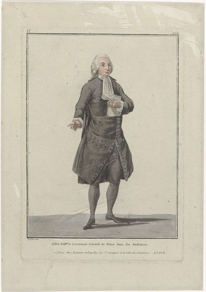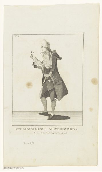 Editor: Here we have "Portret van de dwerg La Grandeur," created in 1738 by Jacques Philippe Le Bas. It's an engraving, and immediately the exaggerated proportions strike me. The head seems disproportionately large for the body. How do you interpret this work through its formal elements? Curator: The distortion of scale, as you observed, is central. Notice how the artist manipulates line and form to create this caricature. The meticulous detail in the face, juxtaposed with the relatively simplified rendering of the body, generates a specific tension. Is this tension playful or satirical, would you say? Editor: Hmm, that's interesting. The figure seems to be presented somewhat formally despite the obvious caricature; a play of seriousness perhaps. How does that balance of detailed facial features with his stubby form guide you to analyze the image as a whole? Curator: Observe the precise and delicate rendering, especially in areas like the face and the checkered floor. How does this careful craft contrast with the distortions within the overall figuration? The interplay creates a compelling dynamic. Where might that dynamic lead you? Editor: That juxtaposition of the figure on the floor plane, his proportions as related to one another, suggests that his presentation must be perceived with intentional deliberation. The craftsmanship highlights the contrast between intention and interpretation, if that makes sense? Thank you, this has been illuminating. Curator: Indeed. And by observing line, form, and composition in meticulous juxtaposition we come closer to an aesthetic awareness of its subject. Thank you for this engaging exchange.