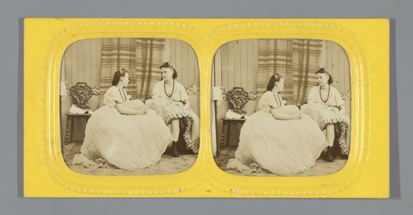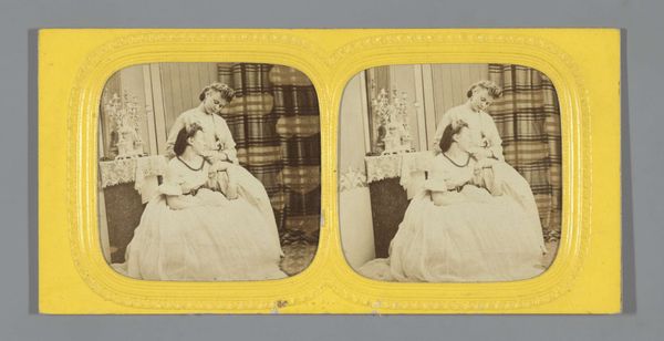 Curator: Here we have an interesting example of early photography entitled "Paar waarvan man in historische kleding," which translates to "Couple with man in historical clothing," dating from somewhere between 1860 and 1870 and attributed to Anatole Pougnet. What are your immediate impressions? Editor: My eye is drawn to the way the light falls across her dress. There's a beautiful gradation, almost sculptural in how it defines the folds of the fabric. The texture alone creates visual interest in what otherwise seems to be quite standard subject matter for its time. Curator: Indeed. Let's consider the means of production, though. This photograph was likely produced using the carte de visite format, small photographic prints mounted on card stock, a hugely popular and affordable medium during the mid-19th century. Its mass production is crucial for understanding its appeal to a wide range of consumers. The labor and consumption around these types of photographic portraits speak to new economies and material exchanges within French society. Editor: I see your point about democratization of portraiture through mass production; however, the aesthetic choices here are intriguing. The backdrop looks almost painted, blurring the lines between theatricality and reality. And the soft focus creates this wonderfully hazy, dreamlike quality overall, wouldn't you say? It leans toward Romantic ideals even with this modern process. Curator: Yes, and consider their staged costumes, perhaps hired for the occasion! What does it mean to *perform* historical identity, to partake in costumed reenactment within the rapidly shifting social landscapes of the time, when photography allowed these fictions to enter homes on affordable terms? This image hints at anxieties around the production of self, commodity, and class status during the early Second Empire period in France. Editor: That’s interesting. Though when you strip away the socio-historical dressing, I come back to the carefully constructed composition. The dark of his coat anchors the left side, creating this strong diagonal line that is balanced by her sweeping dress. The subtle gaze shared, that tender focal point...It speaks of more universal human conditions, like longing and the weight of social expectations. The artist made striking decisions. Curator: The material conditions enabled new forms of intimacy to circulate. But how are these notions of self, family and legacy caught within commodity forms? So, in this respect, can we read even that intimate glance outside structures of mass commercial appeal? Editor: Perhaps we meet somewhere in the middle— a tender moment made newly accessible as a reproducible format. I certainly see value in that combined view.