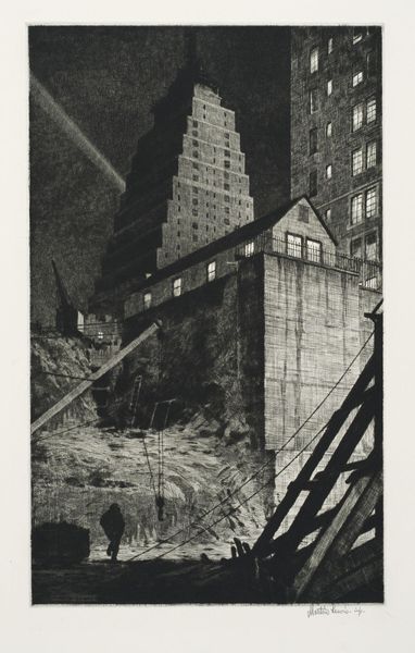 Martin Lewis made this print, Building a Babylon, Tudor City, N.Y.C., using drypoint, a printmaking technique, to render a night scene, perhaps in the 1930s. It’s a dance of blacks and grays where every line feels etched with intention. Up close, you can almost feel the burr of the drypoint digging into the metal. The texture isn't just seen, it's felt – a gritty urban landscape brought to life. Look at the sky, those fine, almost vibrating lines suggesting light or maybe the city's glow, and then your eye is drawn to the towering structure, a ziggurat of modernity. What’s compelling is not only the architectural form, but the way the artist uses mark-making to evoke a sense of scale and atmosphere. I’m reminded of Piranesi, who also explored architectural spaces, but here, Lewis captures something distinctly American: the grandiose ambition and the gritty reality of building a metropolis. Ultimately, it's a testament to the idea that art is not about answers but about opening up new spaces for questions and experiences.
