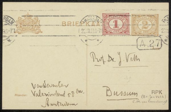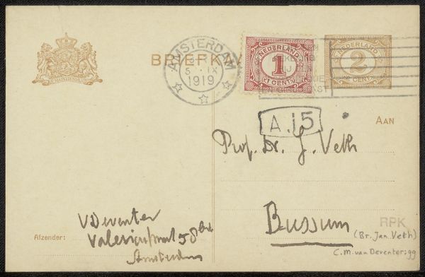 This is a postcard to Jan Veth, postmarked in Amsterdam, from Chap van Deventer, dated August 22, 1919. World War I had just ended, and while the Netherlands remained neutral, the war's impact was felt across Europe. In this context, we can see the postcard as a poignant reminder of communication and connection in a world disrupted by conflict. The stamps and postmark offer a glimpse into the postal system of the time, and, by extension, the social networks that it facilitated. Jan Veth, the recipient, was a prominent artist and critic. This tells us something about the artistic circles in which Van Deventer, the sender, likely moved. The brief message and the personal nature of the correspondence remind us that art is always embedded in a web of human relationships. Historians can look to postal archives, biographies of the figures mentioned, and studies of Dutch society in the early 20th century to better understand the artwork. This little piece of ephemera offers us a window onto a specific moment in time.