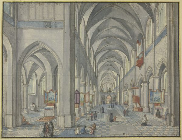 Editor: This painting, "Interior of a Three-Aisled Gothic Church during a Sermon," by Peeter Neeffs the Elder, likely completed around 1630, is amazing. It's incredibly detailed, yet feels somewhat distant. All of those people gathered for worship in such a vast space. What symbols or narratives do you see embedded within this church interior? Curator: The architecture itself is highly symbolic. Gothic churches were designed to evoke a sense of awe and divine presence, with their soaring arches pointing towards the heavens. This church appears very orderly. Do you see any common motifs or symbols repeated throughout? Consider the windows, the patterns in the floor, the arrangement of people... Editor: Now that you mention it, the repetition of the arches creates a strong feeling of linear perspective, and the black and white tile floor draws my eye back and into the distance. Even the placement of the figures seems purposeful, like a visual echo of the architectural structure. Curator: Precisely! This controlled perspective creates a sense of both immense space and structured order. In some traditions, black and white, arranged checkerboard fashion, symbolized life’s dualities. Also consider that during the Baroque period, visual art was often a deliberate tool of religious expression, reinforcing doctrines and moral narratives. What stories do you think these structural or figurative patterns aimed to communicate? Editor: So it's like the architectural details are communicating on their own. Maybe a statement on divine order in human life, and its omnipresence? Curator: Exactly. Artists used symbols rooted in commonly held cultural understandings. Understanding these codes unlocks further levels of meaning in art. Editor: This has truly changed how I see the painting! Thanks for pointing out what's truly being communicated here. Curator: Indeed, the ability to perceive cultural narratives allows one to "hear" what a painting has to say.
