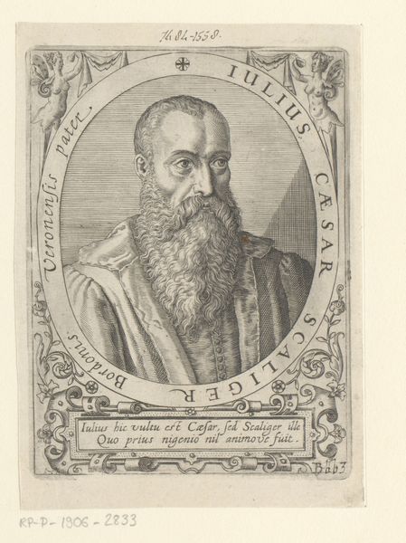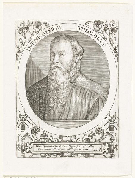 Theodor de Bry created this portrait of Cyriacus Spangenberg as an engraving. De Bry, an engraver and publisher during the late Renaissance, operated in a world undergoing immense religious and intellectual upheaval, and his art often reflects these tensions. Here, we see Spangenberg, identified as a theologian, framed within an ornate oval. Note the Latin inscriptions, indicating an educated, elite subject. Spangenberg's severe gaze and long beard suggest wisdom and authority, conforming to the era's representations of male intellect and piety. However, the very act of creating and circulating such a portrait speaks to the changing roles of individuals within society. Printmaking allowed for wider dissemination of images, challenging the traditional power structures of the church and aristocracy by enabling new forms of personal recognition and influence. This portrait embodies the intersection of religious identity, social status, and the burgeoning power of the printed image in shaping individual and collective identities.