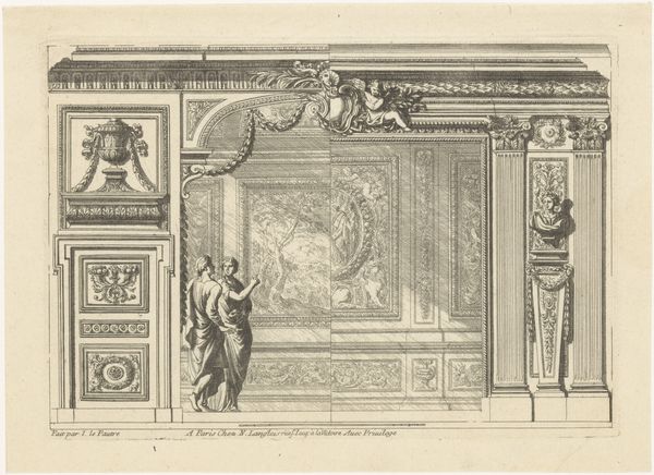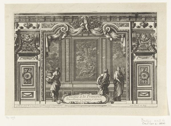 Curator: This engraving before us, "Alkoof met variant voor rechterhelft," created around 1678 by Jean Lepautre, offers a fascinating glimpse into the opulent designs of the Baroque era. Editor: It strikes me immediately as being excessively ornamental. Every surface seems to be striving for attention! Curator: Indeed. Lepautre, a prominent figure in decorative arts, catered to the demands of Louis XIV’s court, which explains the grandeur on display here. Alkoofs like these weren't just about aesthetics; they symbolized status and power within the French court. Notice how this print is like an architectural study, almost a catalogue. Editor: Yes, look at the division. The clean lines and almost diagrammatic approach allows you to really study the details. There’s such emphasis on line and form. The contrast in textures achieved through line work—the smooth, draping fabric versus the carved details, for instance—is particularly compelling. Curator: Lepautre’s work reflects the burgeoning print culture of the 17th century. Engravings like these circulated widely, influencing interior design across Europe. It allowed the French aesthetic to shape design for many decades after. Editor: And the subject matter speaks to the aristocratic obsession with antiquity! Look at those figures…vestal virgins and cherubs that seem plucked from a Roman frieze! Curator: These classical allusions were fundamental to legitimizing the French monarchy; tying the reign of Louis XIV back to powerful imperial precedents of Ancient Rome. Editor: I'm also struck by the artist's strategic approach to lighting and shadow. Lepautre coaxes real dimension from his limited palate, making that heavy drapery positively luminous and those carvings seem even more striking. Curator: This piece gives us much to think about: a society embracing lavish ornamentation as an expression of authority and the evolving role of prints as not only artworks in their own right but also powerful agents in the spread of cultural ideas. Editor: Agreed. By diving deeper into Lepautre's work, one appreciates just how complex an interaction it can be—the interplay of line, volume, symbol—that communicates luxury with incredible effectiveness.
