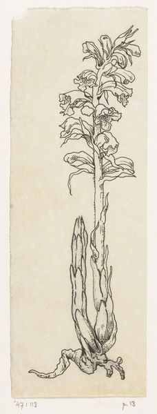Editor: Here we have "Pinksterbloem"– roughly translating to "Pentecost Flower" – a botanical drawing created between 1892 and 1940 by Henri Verstijnen, rendered in ink on paper. It feels very precise, almost clinical, despite the softness of the floral subject matter. What do you see in this piece, considering the historical context? Curator: Looking at this delicate drawing, I am struck by the political history inherent in botanical illustration. The period saw the rise of scientific expeditions, fueled by colonialism, which aimed to classify and exploit the natural world. How might Verstijnen’s choice of subject matter relate to this broader socio-political trend? Was it merely decorative, or could it be seen as participating in a larger project of categorizing and understanding nature for societal gain? Editor: That's a fascinating point. I hadn’t considered the connection to colonialism. The scientific observation versus artistic expression. It does seem meticulously rendered, lending credence to a scientific objective, almost like a catalog. But I still see some playfulness to it. Curator: Consider also the institutional framework in which such a drawing would exist. Was it commissioned for a botanical garden, a scientific publication, or intended for a private collector? These factors significantly shaped the work's meaning and public role. What kind of authority would Verstijnen assume when creating this piece and for what audience? Editor: It really reframes the drawing to think about it less as an objective study and more of an artwork existing within specific social and political systems, and also makes you consider Verstijnen's motivations. Thanks for making me think about this artwork in a completely new way. Curator: Exactly. Understanding the power dynamics influencing art allows for a deeper and more nuanced appreciation of its meaning and historical significance.