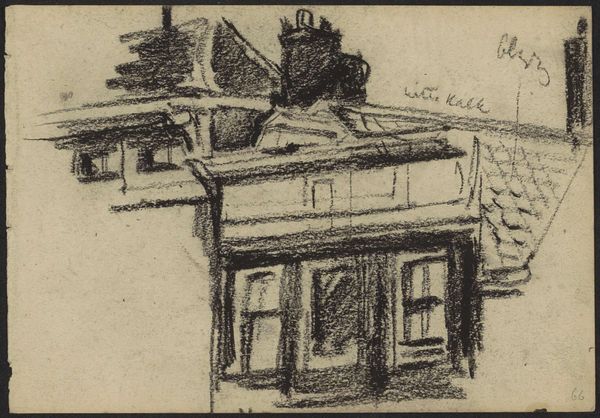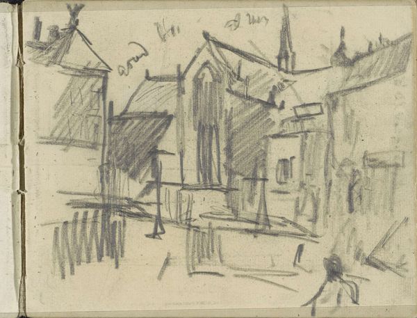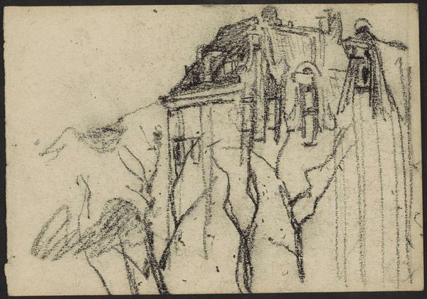 Curator: "Huizenrij in Amsterdam," or "Houses in Amsterdam," is an arresting sketch attributed to Willem Witsen, created sometime between 1870 and 1923. It's currently held here at the Rijksmuseum. Editor: Gosh, it's moody, isn't it? It looks like it could be a half-remembered dream of Amsterdam—all hazy shapes and lurking shadows. Curator: The materiality certainly contributes. It seems to be charcoal or pencil on paper, judging by the granular texture. Note the deliberate, yet rough strokes—lines used more for suggestion than exact representation. The architecture is present, but almost dissolving. Editor: Yes! It's there but fleeting—like the city might vanish if you look away. Those vertical strokes, grounding the buildings, could also be rain, maybe? Is it that ambiguity that pulls me in? Or, is it just my gloomy disposition today? Curator: That ambiguity, as you put it, creates a dynamic tension. The composition itself is structured around these verticals. It's also interesting how Witsen plays with the negative space around the structures, allowing the buildings to breathe, almost as if he is trying to grasp the urban environment. Editor: You're making me see it now; I keep coming back to how immediate and intimate this feels. It is like stumbling upon someone’s personal sketchbook—a quick impression captured before it disappears! Makes you wonder what Witsen was thinking, or feeling that day. Was it raining for real? Or maybe it was just the looming specter of change, transforming the familiar into the ephemeral? Curator: The open-ended narrative resonates. Whether intended or not, it evokes the ceaseless flow of time, a central theme of modernity. Editor: Makes me wanna grab my own sketchbook and get lost in some old neighborhood. Thanks, Willem. Curator: Indeed. It's a poignant reminder of the power of the sketch to convey a city’s—and an artist's—soul.