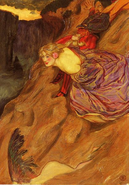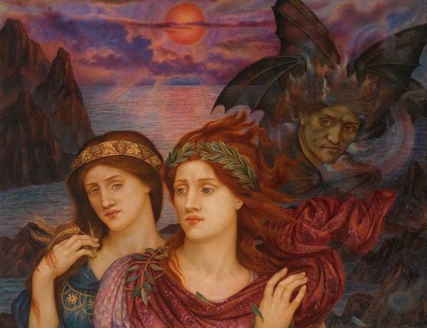 Editor: Here we have Evelyn De Morgan's "The Passing of the Soul at Death," painted in 1918. It's an oil painting, and I’m immediately drawn to the juxtaposition of the earthly figure with the ethereal one. What do you see in this piece? Curator: Looking at De Morgan’s use of materials, I’m struck by how she’s used oil paint to delineate the class dynamics embedded within spiritualism. Consider the rich textures in the drapery, the landscapes—how they consume costly pigments derived from exploitative colonial trade. Is this vision of death a luxury afforded by the elite? Editor: That’s a fascinating perspective! I was focused on the symbolic representation of death and the soul’s journey, but I didn't think about the economics of creating this kind of artwork. Curator: Precisely. Notice the sheer labor invested in the detailing of the fabrics versus the simplification of the background. The materiality itself speaks to a hierarchy. It wasn’t simply about depicting the soul’s journey; it was also about showcasing wealth, the result of unequal global labor relations, through artistic skill. What statement does that choice of skill imply about art making? Editor: So you're saying the materials and the skill deployed in representing those materials contribute to a social commentary? The Pre-Raphaelites aesthetic, often celebrated for beauty, can be seen through the lens of labor and class? Curator: Exactly. De Morgan wasn’t merely illustrating a concept. The choice of materials, the sheer scale, reflect social values concerning who can afford death and the representation thereof. Editor: I hadn't considered the Pre-Raphaelites in that way before. Thanks for pointing out how material and technique create deeper readings. Curator: My pleasure! It’s crucial to understand that every brushstroke carries social weight, whether intended or not.