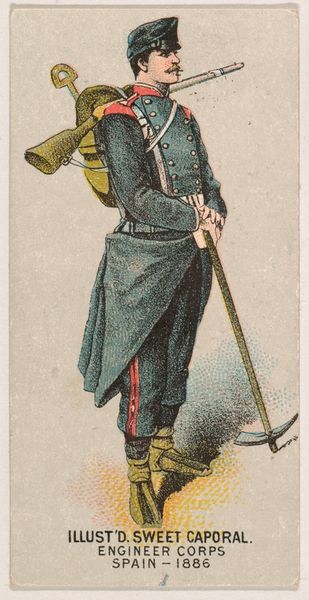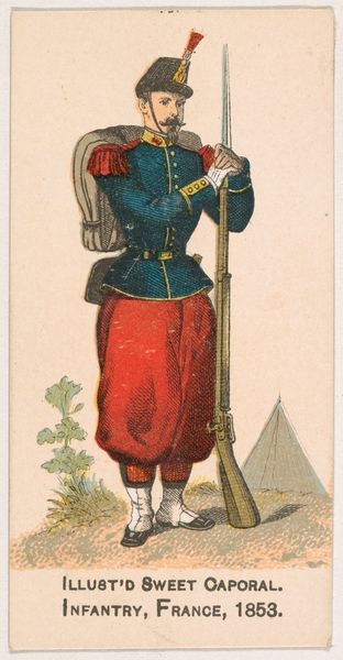 Curator: Let's talk about "Infantry, Spain, 1886," a piece from the Military Series, circa 1888. It was actually produced by the Kinney Tobacco Company as a promotional item for their Sweet Caporal Cigarettes. Editor: It strikes me immediately as oddly romantic. He has such an earnest, if slightly world-weary, look in his eyes. Is it meant to glorify military service, or subtly critique it? Curator: In its historical context, such series played into the era's jingoistic sentiments. Think about the late 19th century; it was a time of intense nationalism and colonial expansion. Images like this, mass-produced and widely circulated, certainly contributed to a climate of patriotic fervor. Editor: But see how he grips the rifle—not with aggression, but almost protectively? And the soft color palette… the faded blues and reds speak of nostalgia, maybe a yearning for a past glory, more than outright celebration of warfare. Even the pose suggests quiet reflection. Is he more symbolic than representative? Curator: That's an interesting interpretation. These images, distributed with tobacco products, were meant to be collected, traded, and admired. It was really about branding, using historical or exotic military figures to associate a sense of adventure and sophistication with the Sweet Caporal brand. There is even an "academic art" undertone to the series. Editor: It is a product of empire. That's undeniable. However, consider the semiotics. The soldier’s attire, specifically the red trousers, are visually dominant and are symbols of bravery, sacrifice, and historical narrative. He holds these inherent cultural implications within him. They add depth beyond a simple advertisement. Curator: That raises a key point about the nature of images in popular culture. Even when designed for a specific purpose like marketing, they inevitably become embedded in broader social and cultural narratives. Editor: Precisely. He becomes a vessel filled with all the cultural implications of Spain, soldiery, and duty in the modern era. It all blends in a dizzying symbolic swirl, which I feel may be missed if we view the subject too broadly. Curator: Well, seeing how that military fashion would likely become outdated pretty soon, Kinney Brothers Tobacco surely understood the appeal of presenting timeless "academic art" pieces as collectables with their products. A clever, but very common way to drive commerce. Editor: And in a strange way, that also helps him maintain the ability to hold the multiple meanings we are giving him today. He manages to still invite a sense of both critical study and reflective reverence in the viewer. Curator: An unlikely survival. I agree. Editor: A perfect example of layered cultural baggage—for better and worse!