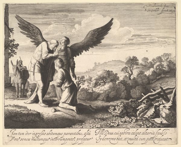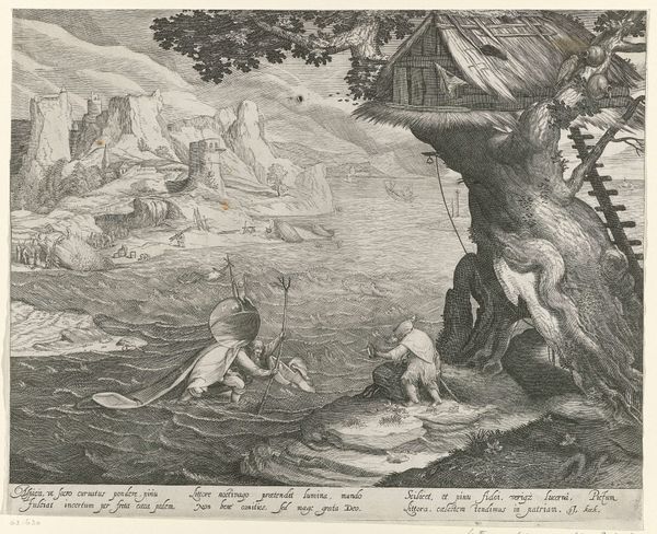 Editor: Here we have Hendrick Goltzius's engraving, "Coronis Changed into a Crow," from 1589. The contrast between the figures and the landscape makes it feel dramatic, almost theatrical. What do you see in this piece? Curator: It's impossible to ignore the gender dynamics here. Coronis's transformation isn't simply a magical event; it's rooted in narratives of female transgression and male authority. The way she’s depicted fleeing a lecherous god, being literally displaced from her body, reflects the historical suppression of women’s agency. Notice Neptune's forceful pose. How does that strike you in relation to Coronis's vulnerability? Editor: That's interesting. I hadn’t thought about Neptune as being forceful. I was more focused on Coronis's flight and vulnerability. I see now that his dominance in the frame is intentional. Curator: Precisely! The Mannerist style further enhances the artificiality of the scene, highlighting the constructed nature of these power dynamics. This is not simply a mythological scene; it's a coded commentary on social structures and power. Goltzius is participating in a visual language that reinforces certain hierarchies. And what about the landscape? Does it play a passive role? Editor: I assumed the landscape was just background, but now I wonder if it symbolizes the world these figures inhabit, a world governed by these power structures. Curator: Exactly. This image makes us consider the active role art plays in perpetuating and, potentially, challenging the societal norms. Hopefully we recognize that a mythological subject can act as a form of political expression. Editor: Thank you for pointing out these themes; it offers a different interpretation than I had at first. Curator: My pleasure. Approaching art this way opens a world of questions that connect the past to our present.