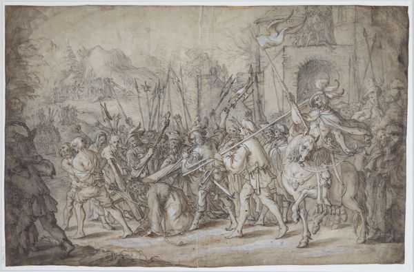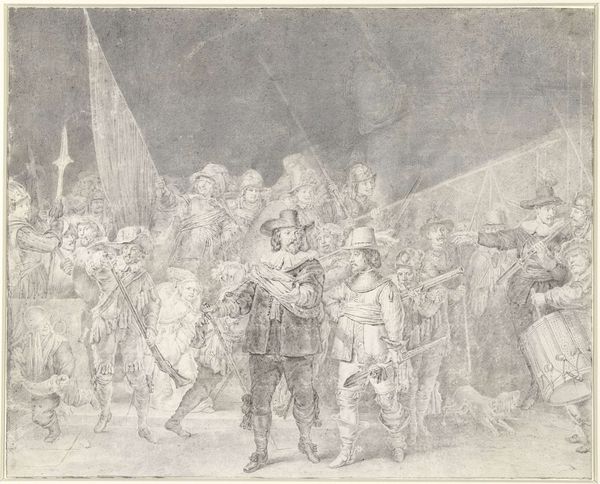Editor: So, this is Lucas van Leyden's "The Conversion of Paul," created around 1509. It’s an engraving, a print… what immediately strikes me is the level of detail he achieves. What's your take? Curator: Well, consider the materiality first. Engraving demands a deep understanding of metal, acid, and pressure. The labor involved is intensive, requiring a mastery of craft not typically associated with “high art”. It’s not just the narrative that matters; it's the *means* of production that speaks to its value. How was such detail achieved? Editor: True, thinking about the physical process... all those lines! Does that have to do with why the landscape is so emphasized here? It's not just background. Curator: Precisely! The landscape isn’t mere scenery; it is a stage shaped by human interaction and exertion, a backdrop that both influences and is influenced by it. Look at how the etching renders the textures of the land, mimicking natural forms with industrial means. And the figures in this landscape... Editor: Yeah, all geared up. You can tell it took considerable work to create that level of intricacy across so many figures and outfits. Curator: Exactly. The labor of the artist mirrors, in a way, the implied labor of the soldiers and their social order. Also, consider that prints are reproducible commodities. What impact did making this art so reproducible have at the time? Editor: I hadn’t thought about that. I was so focused on just how painstaking each print would be to create. This opens my mind to appreciating more than the imagery! Curator: Indeed. By acknowledging process and means, we gain insight into art’s social, economic, and material existence. It's more than just the image; it’s about the how and the why it came into being.
