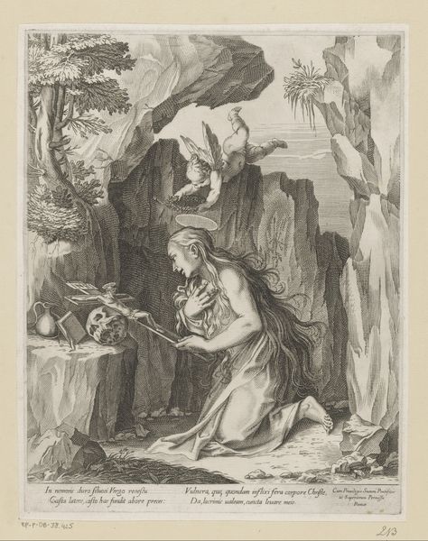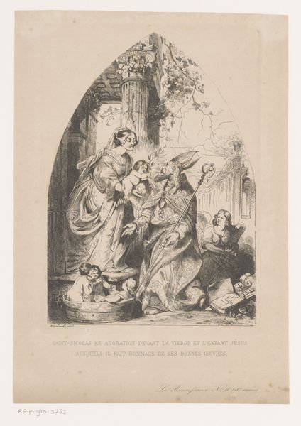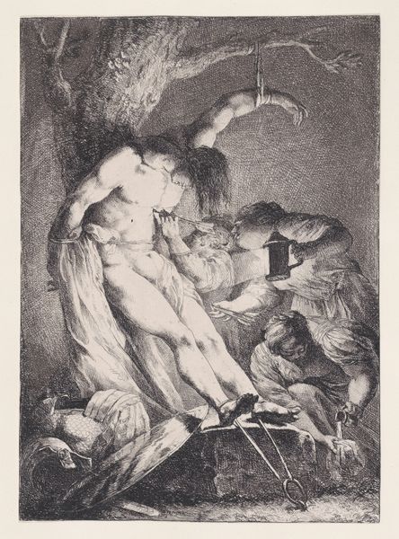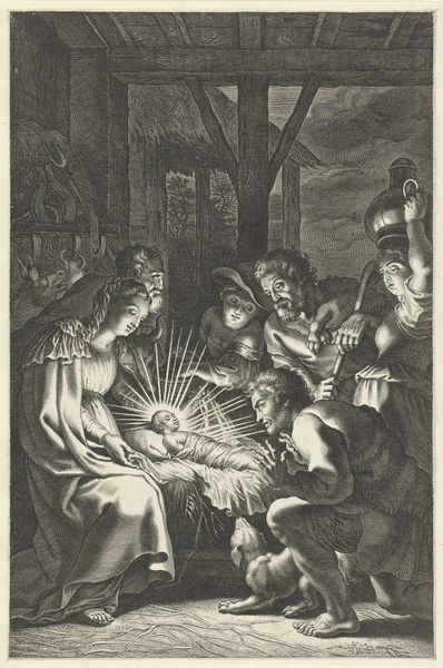 Editor: Here we have "Adoration of the Shepherds," a baroque print made sometime between 1614 and 1676 by an anonymous artist. I’m struck by the sharp contrast between light and shadow – it almost feels staged. What catches your eye? Curator: The deployment of light, quite literally, structures our perception. The radiant aura surrounding the Christ child acts as the nucleus around which the entire composition resolves. How would you characterize the formal relationship between this focal point and the arrangement of the figures? Editor: They seem to be arranged almost symmetrically around it, directing our eyes inward. The gazes, postures… they all lead us back to the light. Is there anything else to notice regarding the composition of the scene? Curator: Consider the use of line – the varying densities of cross-hatching used to model the forms and create depth. Observe, for instance, how the engraver uses line to define the drapery, which seems to both conceal and reveal, while also adding dynamism to the essentially static scene. Doesn’t this controlled, almost mathematical, arrangement point to something deeper about its meaning? Editor: Perhaps it speaks to the divine order being revealed in this humble setting? Everything in its right place… Curator: Precisely. The artist masterfully employed formal devices to convey a particular reading of a foundational narrative. What do you think we gain by focusing on these material and structural aspects? Editor: It gives us a richer, perhaps more analytical appreciation. Focusing on form gives us access to intention in addition to simply absorbing the symbolism or historical significance. Thank you! Curator: It highlights the choices made and how they shape meaning. A rewarding exploration.