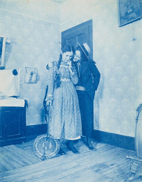 Editor: So this is “Winterbottom Sisters,” a gelatin silver print dating around 1900. It’s… very blue! I’m also struck by how staged it feels, but there's still a sense of intimacy. What stands out to you about this piece? Curator: Beyond the tonal qualities, consider the historical moment. These women are pictured with tennis racquets, implying leisure and access to specific social spheres. How do you see their representation challenging or reinforcing gender roles of the time? Editor: I see what you mean. On the one hand, they’re clearly educated and enjoying activities not traditionally associated with women. But is their wealth the reason why we can admire that, since their social mobility depends on socioeconomic factors that not everyone shares? Curator: Exactly. The “private sphere” and its relationship to visibility becomes complex. The backdrop seems homey and comforting, right? Editor: Very much so! There’s the patterned carpet and wallpaper, the picture frames on the wall, and even a pot of flowers. It really reinforces the sense of domesticity. Curator: And isn't there a tension there? Aren’t they pushing beyond prescribed roles, but within a clearly defined, privileged space? We might think about what this carefully constructed image communicates about the photographers themselves and their place in society. What might they have hoped to convey? Editor: It makes me think about agency. Did these women have control over their own representation? Were they actively participating in shaping their image? Curator: Those are crucial questions. By situating "Winterbottom Sisters" within a broader discourse, we can reveal the complexities of identity and representation at the turn of the century. Editor: I learned a lot about how social context changes the way we read images. Curator: Indeed, it enriches our understanding of visual culture.