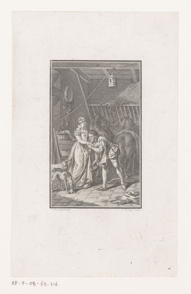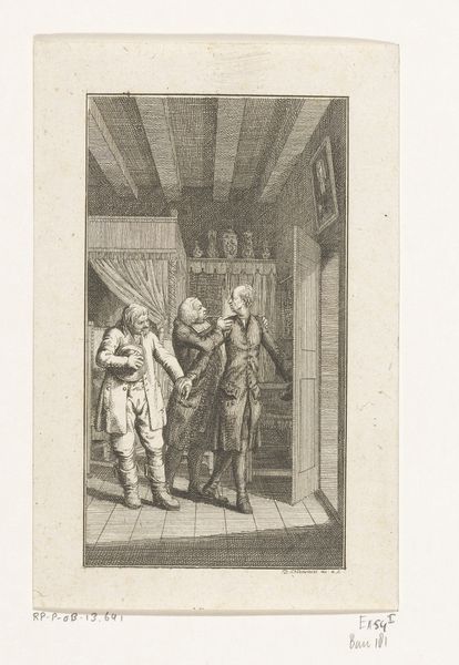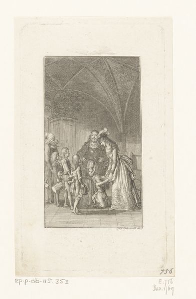 Daniel Nikolaus Chodowiecki made this etching, "Predikant Stollbein bij de familie Stilling," in the late eighteenth century. It captures a moment of domestic religious instruction. The print offers us a window into the social fabric of the period in Germany. We see the pastor, Stollbein, seated comfortably, suggesting a position of respect and authority. The setting, a modest home filled with everyday objects, hints at the values of simplicity and piety. The presence of the family, including a young boy reading, underscores the importance of religious education within the household. The image is likely a comment on the social structure of the time, in which religious leaders were highly esteemed members of the community. As historians, we can turn to period sources, like religious tracts or domestic manuals, to better understand how faith was practiced and taught within the family. By looking at the conditions that shape artistic production we can gain a deeper appreciation of the cultural norms of the time.