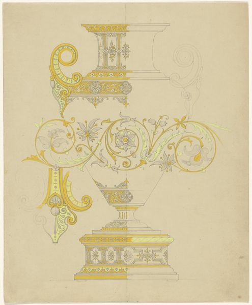 Editor: This is Paul Louchet's "Design for a Pendant with a Woman with Dragonfly Wings, of Gold, Rubies, Opals, and Enamel" from around 1905. The delicacy of the watercolour illustration gives me a feeling of yearning and ephemeral beauty. How do you interpret this work? Curator: It whispers of dreams, doesn't it? Louchet masterfully embodies the Art Nouveau spirit here. The feminine form intertwined with the dragonfly – symbolising transformation and lightness – is archetypal. What intrigues me is how it flirts with a slightly darker, melancholic sensibility, a common thread in late Romanticism that bleeds into the early 20th century. Do you see how the opals hint at teardrops, anchoring the flight of fantasy with earthly weight? Editor: I do see that! It makes the whole piece a little bittersweet. The Pre-Raphaelites also loved these sad, dreamy figures, right? Curator: Absolutely. Louchet is drawing from a similar well, steeped in mythology, with a strong sense of craftsmanship. I wonder, do you get a sense of its potential scale from this design? Can you imagine it being grand and imposing, or more intimate? Editor: I picture it being smaller, precious… worn close to the heart. Looking at it again, the woman seems more resigned than joyous. Almost weighed down by the jewels surrounding her. Curator: Precisely! It is a reminder that beauty often carries a trace of sorrow within it, and it has opened a perspective that reveals much to us. Editor: This has opened my eyes to the darker, bittersweet elements within such pieces, where the line between beauty and sadness blurs so poetically. Curator: Indeed. It shows that even the most beautiful fantasy can carry the weight of reality.