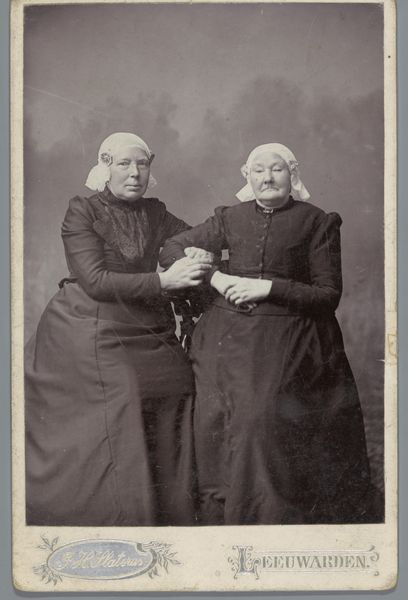 Editor: This photograph by A.J. Rapozo, titled "Costumes of Michaelenses, Azores, Portugal," depicts two figures in enveloping capes and hoods. The muted tones and obscured faces create a rather mysterious atmosphere. What do you see in terms of the formal elements at play? Curator: Observe how the artist employs the voluminous shapes of the capes and hoods to dominate the composition. The geometric form creates a striking contrast with the delicate bouquet. How do the lines and forms guide the viewer's eye? Editor: The converging lines of the capes lead the eye to the center, to the flowers. I hadn't noticed that before. Curator: Exactly. The artist's strategic manipulation of form generates visual interest and underscores the focal point. A fascinating study in the power of shape. Editor: It is amazing to consider that simple forms and shapes can create such an enigmatic image.