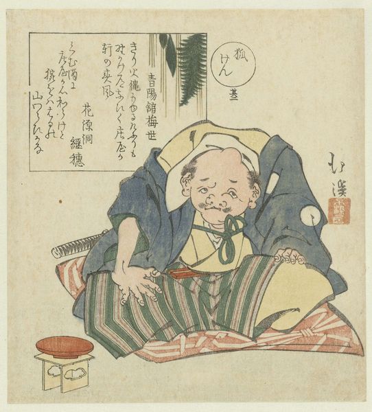 Curator: I'm immediately struck by the satirical edge—it's quite pointed! The artist, Kitazawa Rakuten, captures a mood of cultural transition, wouldn't you agree? Editor: It does, absolutely. We are looking at "Tokyo Puck - February 1909," potentially from that same year. It's a print with ink and perhaps watercolor touches, currently residing here at the Rijksmuseum. Considering the sociopolitical tensions brewing, it feels quite timely. Curator: The layering is incredibly effective. Notice how the foregrounded figure, possibly representative of traditional authority, appears somewhat foolish amidst those strutting chickens. This poses questions around cultural anxieties about modernization, especially in early 20th century Japan. Editor: Precisely! And observe the young student in Western attire receding into the background; an allusion to evolving Japanese identity and rising Western influence in Japanese society? Rakuten skillfully employs caricature—a European import— to critique Japanese society. The very title, *Tokyo Puck*, references the British humor magazine, pointing towards these international dialogues. Curator: And there’s the ukiyo-e influence; though clearly modernized, those line weights and planar compositions give it that distinctly Japanese feel, a very canny melding of styles to comment on tradition vs modernity. Even the presence of farmyard fowl can symbolize something significant beyond their surface appearance here. They draw our eye to the earthbound nature of the central character perhaps suggesting backwardness and inertia in the face of changing times. Editor: These kinds of publications were truly significant vehicles for shaping public discourse, so even something ostensibly "humorous" reflects the shifting allegiances of this historical moment. Examining the satirical magazines helps us to understand attitudes and anxieties towards evolving Japanese society. Curator: Yes. Seeing art in a wider, more complicated social tapestry adds a richness to its significance. This work acts almost as a mirror, capturing all these anxieties of the period through humour and accessible design. Editor: Exactly, by recognizing this print's clever use of cultural symbols, we can get a clear, often comical snapshot of a pivotal era.