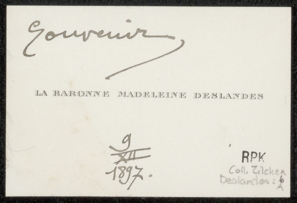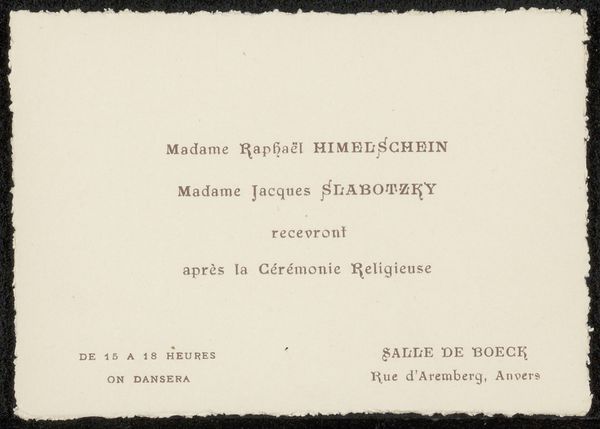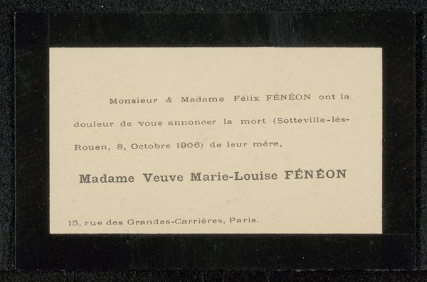 Curator: Looking at this intimate mixed-media print on paper, one feels a palpable sense of quiet grief. Editor: Indeed. This is "Overlijdensbericht aan Philip Zilcken," a death announcement dating from after 1913. The text is entirely in French and announces the passing of Madame Félix Buhot, née Henrietta Johnston, to Monsieur Jean Buhot. It communicates this painful loss to acquaintances. I can delve into the history of death announcements if you would like. Curator: It’s powerful how a seemingly simple piece of typography can evoke so much. But looking beyond its immediate melancholic effect, the class is quite evident. There's a formality implied in announcing deaths this way, signaling bourgeois societal customs that dictate not just mourning but public demonstrations of mourning within tightly regulated societal spaces. I think a deep study into such materials can unlock key understandings of the era's performative sadness and its relationship to status. Editor: Precisely. These announcements were not just personal expressions; they were carefully constructed performances adhering to specific social codes and expectations, often linked to religious practices. Consider, for example, how the text explicitly mentions that religious services were celebrated at the Saint-Georges Anglican Church before the burial. The family is highlighting their position within Parisian society by referencing particular churches. Furthermore, the printer's information – G. Trouvain, a Parisian firm – underscores that the family circulated within a very particular local milieu. Curator: Absolutely, and I can’t help but see a potential reflection on evolving ideas of gender and lineage. The announcement places considerable importance on Henrietta Johnston’s maiden name, underscoring the matrilineal dimension of identity – it brings to mind debates in feminist studies regarding how women's identities are perceived across historical landscapes. Did Johnston retain ties to specific networks connected through her maiden name? This sort of ephemera is so revealing of how familial relations were negotiated publicly. Editor: I agree entirely. And if we also consider that the intended recipient was a man—Monsieur Jean Buhot—this opens further avenues for interpretation related to inherited name, patriarchal lines, and public visibility for male familial figures in early 20th-century Parisian society. Curator: A small piece of paper holding entire social universes within its fibers! Editor: Yes, a modest artifact opening boundless doors for deeper understanding.
