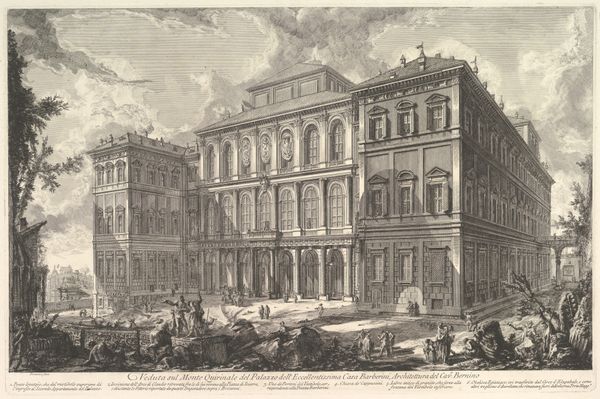 Curator: What strikes you first about this print, entitled "Vedute di Roma," etched by Giovanni Battista Piranesi? Editor: Immediately? It's imposing! I feel like an ant looking up at these grand, looming structures. The perspective makes them feel absolutely gigantic, almost theatrical in scale. There's also this incredible, almost palpable silence. Like the whole city is holding its breath. Curator: That sense of scale is something Piranesi excelled at conveying. As part of a series, these prints sought to capture the grandeur and historical weight of Rome, referencing both its glorious past and its contemporary urban landscape. He focuses heavily on Roman and Baroque architecture, offering insights into the cityscape through detailed renderings of buildings, ruins, and monuments. What do you make of the visual language here? Editor: The detail is astonishing! You can almost feel the texture of the stone, see the individual cracks and weathering. It reminds me a bit of those hyper-realistic architectural renderings, but with an added layer of romantic decay. There’s a strange allure to these scenes of organized entropy. Are the little figures props or key narrative agents? Curator: I think they serve both purposes. Piranesi places tiny human figures throughout his "Vedute" – partially to emphasize scale and provide a sense of everyday life amidst these monumental structures, but also as reminders of the continuous human presence that bears witness to the passage of time. It grounds the idealized grandeur with a sense of relatable existence. There are many echoes in their costuming and attitudes of the distant past. Editor: And that is fascinating. There is a palpable sense of history layered upon history; even in what initially seems to be 'mere' architectural representation. The choice of black and white also contributes; muting the visual noise and drawing you into the timelessness. It's somber, but strangely beautiful. There is drama too, even in something as apparently simple as a city scene in print. I love the theatrical effect! Curator: Exactly. He invites us to consider how the present is constantly shaped and haunted by what came before; history itself becomes a palpable, architectural presence in our lives. This piece invites a slow viewing, one that unravels the cultural continuity inherent to how spaces exist and transform through time. What’s your lasting impression? Editor: I suppose the enduring resonance is this idea of architecture embodying memory – like walking through these grand structures isn’t just an aesthetic experience but an engagement with the very soul of Rome itself. As for this representation: technically brilliant, evocative in mood; it captures an overwhelming feeling that only deepens the more you explore its depths.