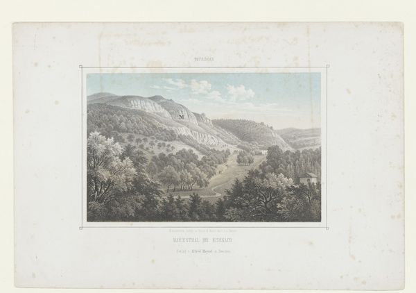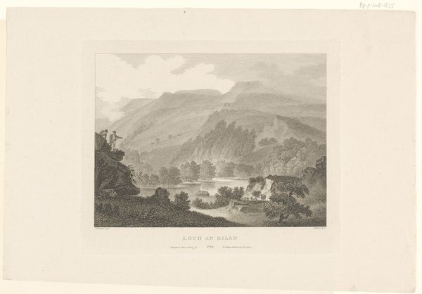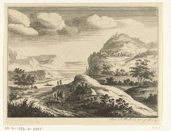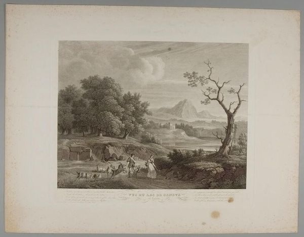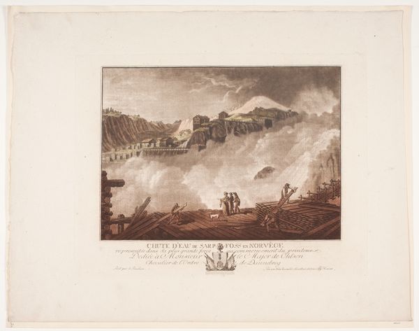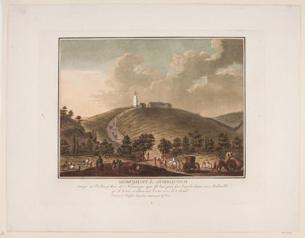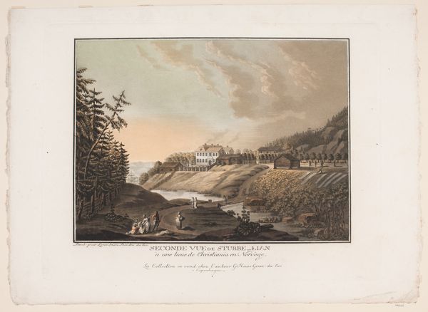 Curator: What a fascinating piece. We're looking at "La citadelle de Frideriksteen" by Georg Haas, created between 1788 and 1792. It’s currently held here at the SMK. The artwork combines aquatint and watercolor, quite elegantly, I think. Editor: My immediate impression is of a peaceful, almost idealized landscape. The muted tones give it a nostalgic quality, and the composition feels very balanced, even serene. Curator: Indeed. The print medium would have allowed for wider distribution of this landscape view, catering to a growing market for picturesque scenery among the bourgeoisie. Consider how the labor involved in producing these prints affects its accessibility. Editor: The choice of watercolor and aquatint is interesting from a formal perspective. Notice how the washes of color create subtle gradations of light and shadow, enhancing the atmospheric perspective. The textures, even in print form, give the impression of depth and space. Curator: Absolutely. And the depiction of everyday life, the figures interacting near the house in the foreground, emphasizes a harmonious relationship between the people and their environment. This can be considered in the broader social context of the time—how did idealized representations of labor relate to the lived realities? Editor: The architecture itself contributes to the composition’s stability. That fortress in the background really anchors the scene. How it towers and dominates. Curator: The citadel represents power and authority, undeniably. By situating the military structure amidst the natural and the domestic, the artist invites us to consider how those aspects of life interact, are made to coexist. The making of those kind of social structures, captured in this media, opens itself to consideration. Editor: A point well-taken. Considering it is made in the 18th Century we get a peek into history. Overall, Haas presents a vision of the world in pictorial terms—ordered, structured and visually appealing. Curator: For me, it’s all about understanding the social function this piece had, where these images where displayed and in whose hands they fell. Editor: Very well said. We have come to terms with different approaches and interpretations of this artwork.