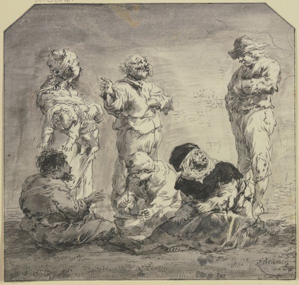 Curator: Oh, my! Look at this wash drawing! It just speaks of vulnerability and noble sacrifice. Editor: Indeed. This work by Nicolai Abildgaard, created between 1743 and 1809, is titled, "Den atheniensiske konge Kodros forlader sit hjem for ukendt at vandre mod fjenderne, til venstre hans kone og søn" – "The Athenian King Kodros Leaves his Home to Wander Unknown Towards the Enemy, his Wife and Son on the Left." It is currently held at the SMK, the National Gallery of Denmark. We see a figure in watercolor and pencil. The bare feet, the sparse possessions... this isn’t just sacrifice, it’s deliberate divestment. What do you sense here? Curator: An aching… yearning. It reminds me of saying goodbye, of choosing duty even when it splinters your very being. He goes willingly towards his end, not for glory, but to protect his own. What a poignant act of love. I get goosebumps! It’s all lines, the immediacy, and that warm sepia wash suggesting a sunset of life. Editor: Right! And consider the artistic economy at play. Look at the figure walking toward the unknown, all essentials bundled on his back, the tools necessary for this sacrifice. Think about the scarcity implied in these choices of rendering with simple materials, reflecting the lean necessities of war itself and also pointing to his agency within the creative labor behind artmaking. It wasn't oil painting on canvas—no! Abildgaard opted for humbler stuff. Why? Curator: Perhaps because the starkness amplifies the human cost. No grandiosity to soften the blow. It’s immediate, raw, visceral, hitting right in the gut. Editor: Exactly. By choosing this process and by making his statement like this, he brings us face-to-face with essential human decisions made for survival that resonate well beyond classical antiquity. The man on the way and his family there: a snapshot into human vulnerability but told using few resources. Curator: It makes you think. It almost feels wrong to analyze it. Editor: Maybe… but the more you contemplate how art like this speaks of humanity and the value in hard and smart material choices, it allows the message and emotions to live well past the moment of creation.