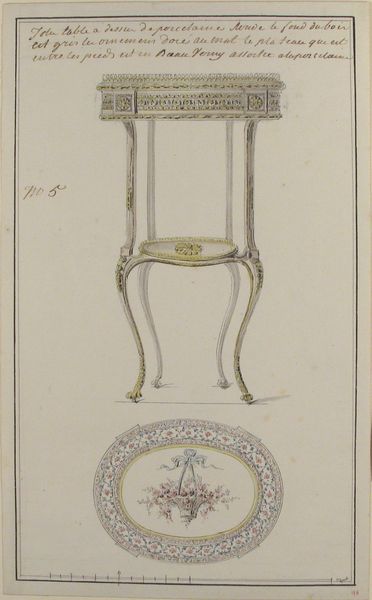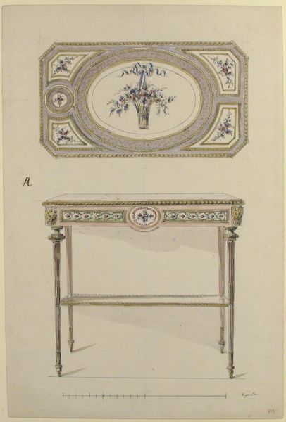 Here we see an anonymous design for an upright drop-front secretary executed with pen, black ink, and watercolor. The sketch presents a symmetrical facade, dominated by a light palette of whites and pale greens, accented with gold filigree, suggesting refinement and luxury. The composition is rigorously organized around geometric forms: note the rectangles and ovals, which are softened by floral motifs. These floral designs, however, are still contained within the geometric frames. It's this interplay between organic and geometric shapes that lends the piece its distinctive character. The design destabilizes conventional notions of furniture as purely functional objects, inviting reflection on the broader cultural values associated with domestic space and social status. The semiotic structure of the design relies on culturally established codes of elegance and sophistication. The design encourages us to consider how aesthetic choices are interwoven with broader systems of meaning.