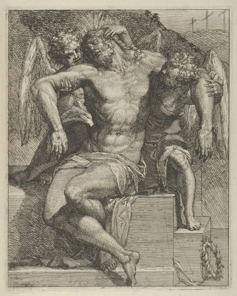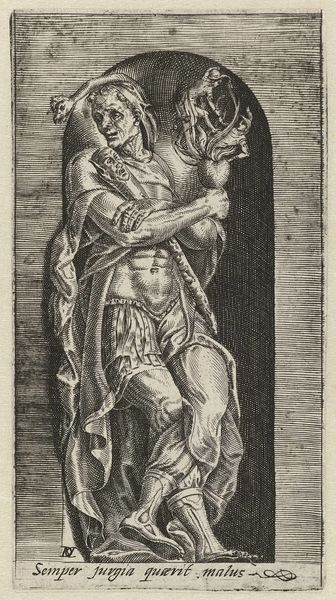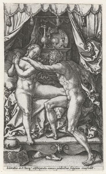 Editor: This is “Hercules en Omphale,” a 16th-century engraving by Jan Gossart, housed in the Rijksmuseum. It strikes me as surprisingly playful for a piece depicting mythological figures. What's your take on it? Curator: Playful is a brilliant word! To me, this print crackles with a certain… mischievous energy. Hercules, famed for his strength, is caught in a rather undignified moment, wielding what appears to be his club. It’s a role reversal. What was a symbol of brute power becomes almost a comedic prop. Does it not strike you odd how casually nonchalant Omphale seems in this whole situation? Editor: It is pretty surprising. Usually, when I think of Hercules, I picture intense heroic feats. I see what you mean; Omphale's calm, almost bored expression really adds to the unexpectedness of the scene. Why do you think Gossart chose to depict this particular scene and to create it with a drawing rather than another artistic expression? Curator: That's a layered question. Remember the Renaissance hunger for antiquity, a renewed fascination with the classics. To create something as evocative as “Hercules en Omphale” served the culture. It might appear simple, but beneath its charming facade, the artwork celebrates the complexities of love, power, and human fallibility. And the choice for an engraving underscores a desire to widely share knowledge of that new imagery with a broader public through portable prints. Can you see how powerful such an image would be? Editor: Yes, that definitely puts it into perspective. It's fascinating how a seemingly simple role reversal can speak volumes about societal power dynamics. Thanks, I’ll certainly be thinking about the comedic prop element next time I visit. Curator: It has been an insightful look at art! Now go be playful!